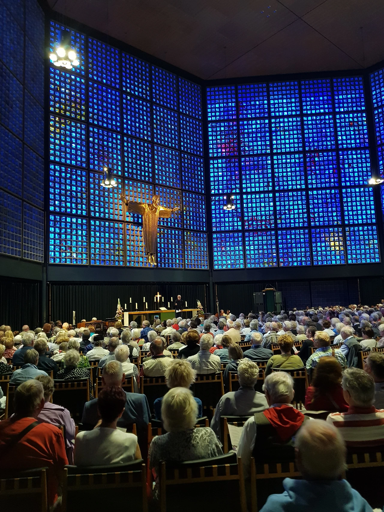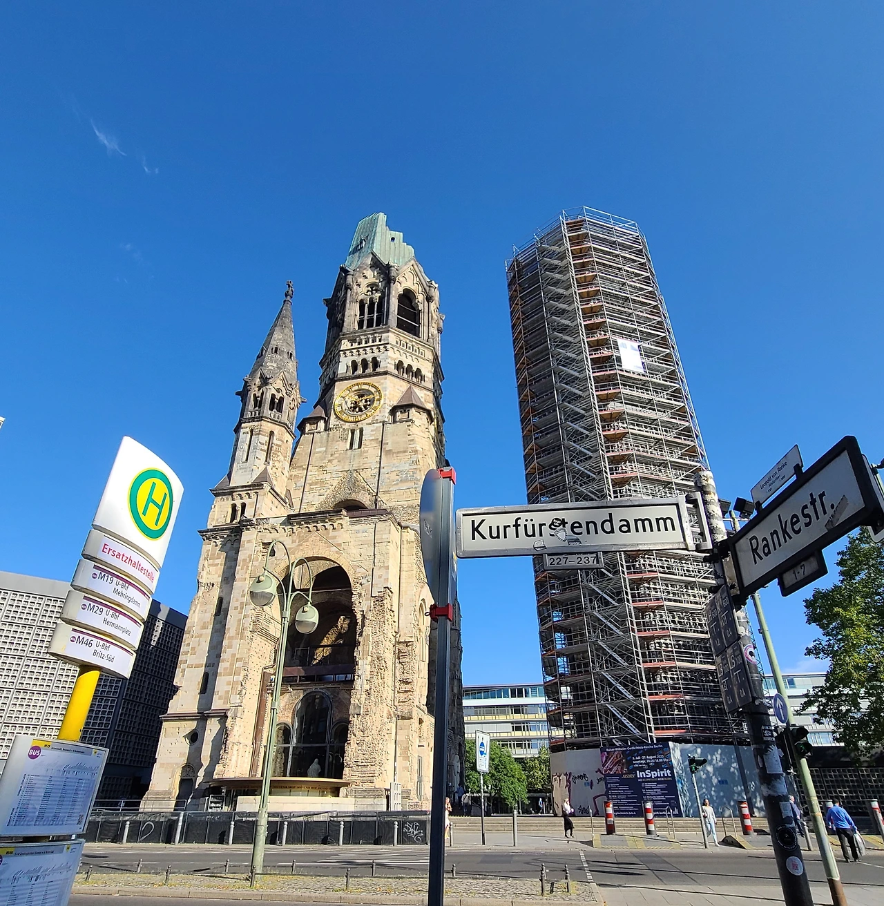 테러가 일어난 곳의 카이저 빌헬름 기념 교회 (Kaiser-Wilhelm-Gedächtniskirche)는 카이저 빌헬름 2세 (Kaiser Wilhelm II)가 독일제국의 통일을 이뤘던 그의 할아버지 빌헬름 1세를 기리기 위해 세운 개신교 교회다. 신로마네스크(Neo-Romanesque) 양식으로 1895년 사이에 지어졌다. 높이 113미터에 2천 여명의 신도를 한 번에 수용할 만큼 큰 규모로 화려한 모자이크와 벽화로 장식된 아름다운 교회였다. 그러나 1943년 2차 세계대전 공습으로 처참히 파손되었고 그중 첨탑 부분만 남겨 전쟁의 참혹함을 상기시키는 기념관이 되었다. 맞은편에는 1963년에 건축가 에곤 아이어 만 (Egon Eiermann)에 의해 모더니즘 스타일의 신교회가 지어졌다. 외부는 시멘트로 된 수수한 팔각형 건물이나 내부는 푸른색을 중심으로 루비 레드, 에메랄드 빛이 어우러진 21,292개의 스테인드글라스로 장식되어 신비로운 반전 매력을 가졌다. 베를린 서부의 가장 유명한 랜드마크로 베를린 사람들은 흉한 구교회를 베를린의 충치( )라고도 부른다. 카이저 빌헬름 구교회에 들어서면 폭격으로 그림이 갈라지고 일부일지라도 황금빛 가득한 정교하고 화려한 장식벽화는 당시 교회가 얼마나 웅장하고 아름다웠는지는 짐작하게 한다. 천정에 알파와 오메가를 사이에 둔 예수와 대척점인 바닥에 아우라로 빛나는 성인 한 명의 대형 모자이크를 발견할 수 있다. 커다란 창으로 용을 퇴치하는 인물은 바로 성 게오르그(Georg Heiliger)다.