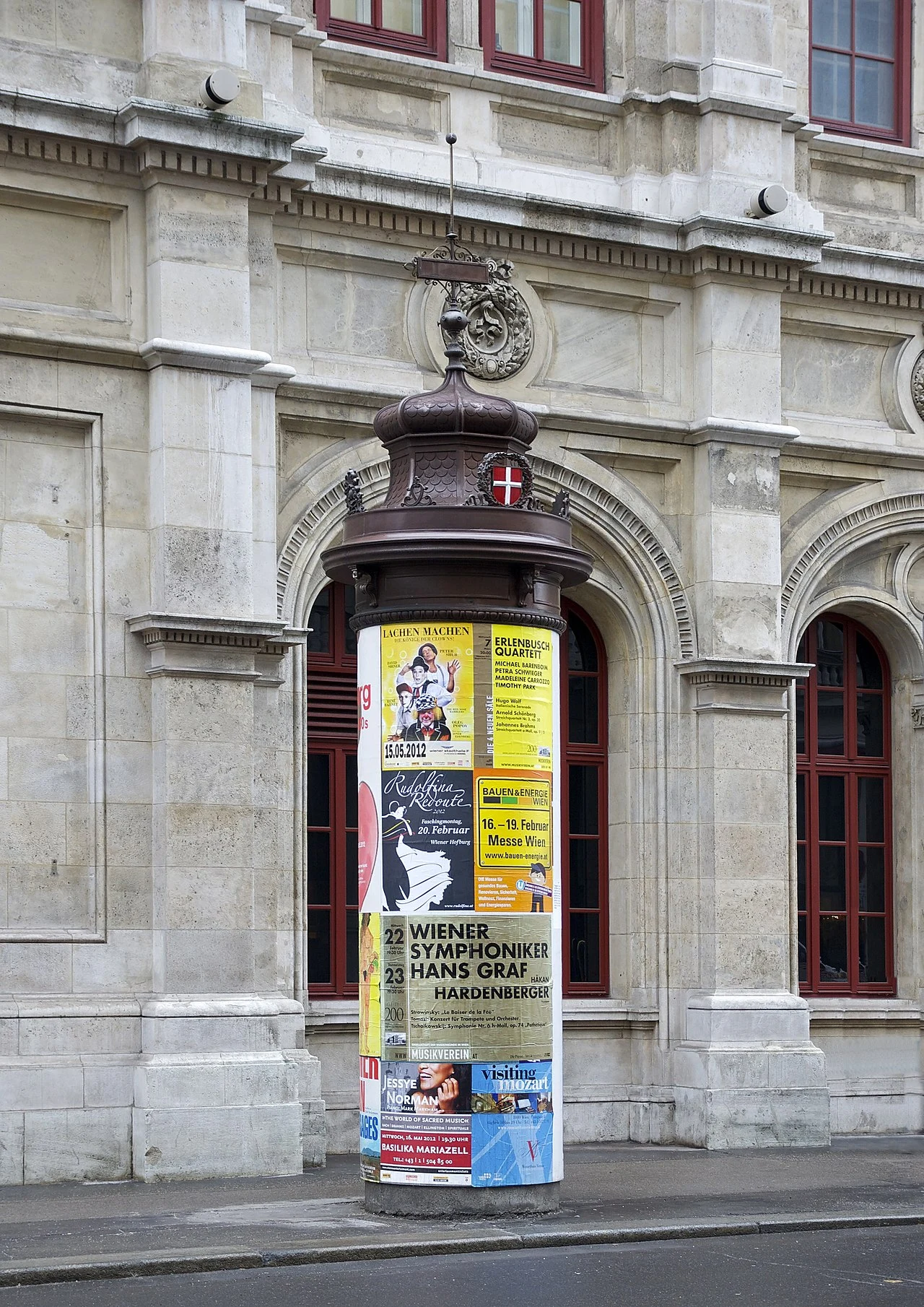 기본 모양은 직경 약 1.4m(원주 3.60~4.30m), 높이 2.60~3.60m의 속이 빈 원형 기둥으로 설계되었다. 이는 포스터의 크기에 관계없이 어떤 것도 붙일 수 있었다. 대부분 철판으로 만들어졌고 나중에는 콘크리트와 인조석도 사용되었다. 넓은 바닥과 둥근 후드가 있고 가장자리를 때로 화려하게 장식하기도 했다.
