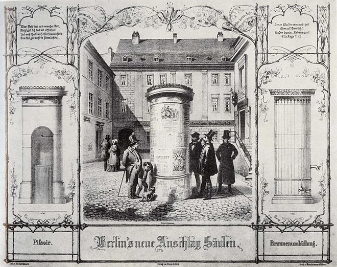 그럼 전기도 나오기 이전에는어떻게 옥외 광고를 했을까. 최초의 옥외광고는 리트파스조일레(Litfaßsäule)라는 광고기둥으로 1854년 베를린의 인쇄업자인 에른스트 리트파스(Ernst Litfaß,1816~1874)에 의해 발명되었다. 사람이 많이 모이는 광장이나 거리에 세워진 기둥에 광고 포스터를 부착하는 형태로 한 명의 광고주가 혹은 여러 광고주가 나누어 홍보를 할 수 있었다. 지나가는 시민들은 멈추어 서서 기둥 주변에서 360도로 광고를 접할 수 있다. 이 기둥은 야외에서 장소에 구애받지 않고 누구나 정보를 접할 수 있는 당시로서는 거의 광고 혁명에 가까운 발명이었다.