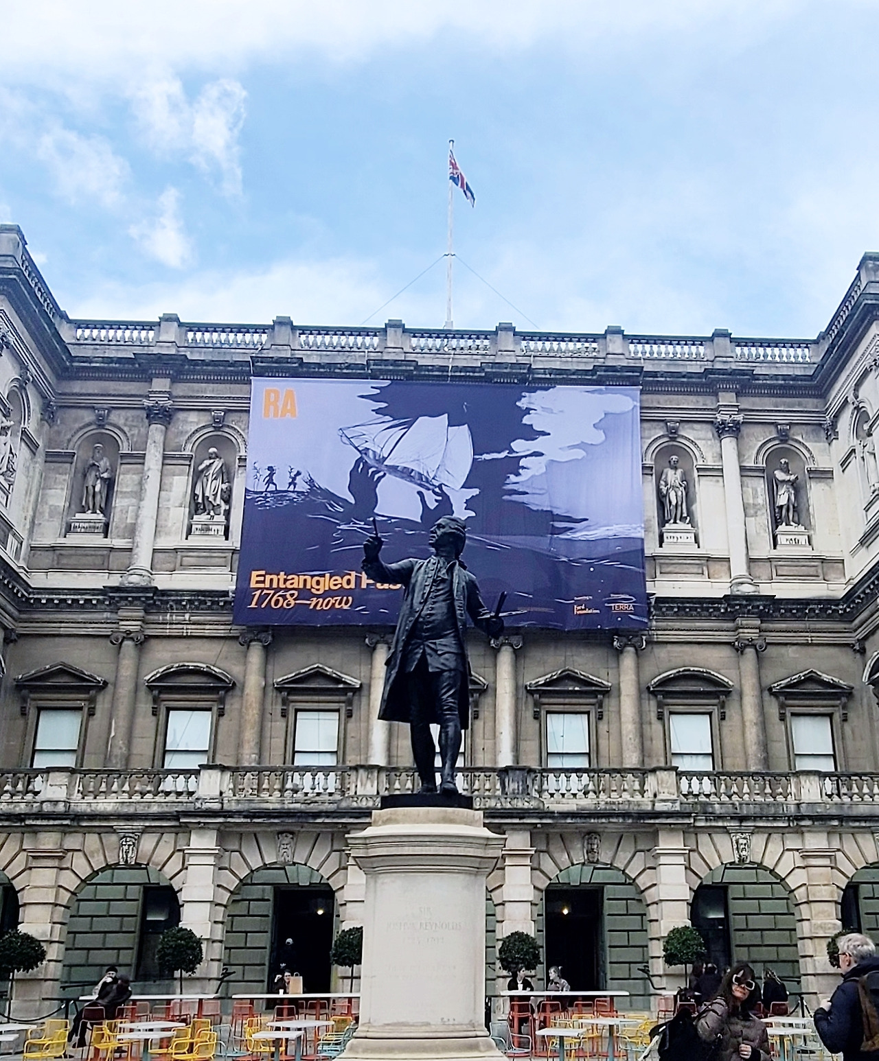 2024년 4월 오늘의 런던은 가끔 해가 나지만 바람이 몹시 불었다. 가지고 온 캐시미어 모자를 어제 테이트모던에서 잃어버려서 더 한기가 느껴진다. 아쉬운 대로 봄스카프를 여미고 걸었다. 마침 영국왕립미술원 정문을 지나가다 안뜰에 무언가 심상치 않은 게 감지되었다. 나와 마찬가지로 사람들은 무엇에 홀린 듯, 자석에 이끌리듯 건물 마당으로 하나 둘 걸어 들어온다.