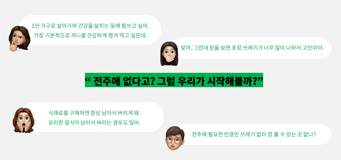 필요한 만큼, 쓰레기 없이 장을 볼 수 있는 곳, 양껏 만든 음식이나 식재료를 나누어 가져가는 자리가 필요하다는 의견이 모아졌다. 생각해 보니, 그 당시(2020.4) 엔 지역마다 제로웨이스트 숍이나 마켓, 리필스테이션 등이 하나 둘 생겨나고 있었는데 전주에는 없었다. "전주에 없다고? 그럼 우리끼리 자그마하게 시작해 볼까? "