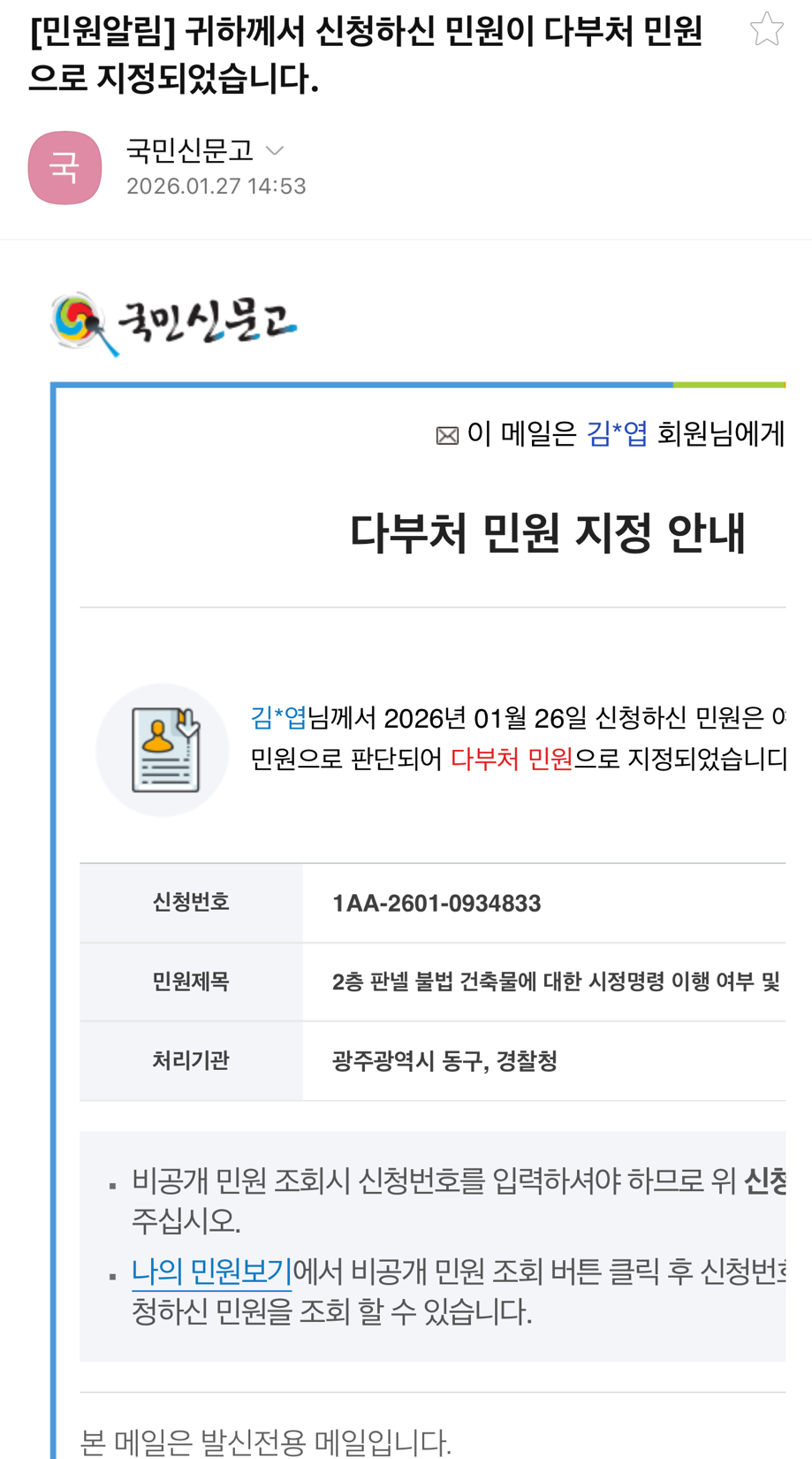 「건축법 위반 여부 확인을 위한 현장조사 알림」을 받았다.