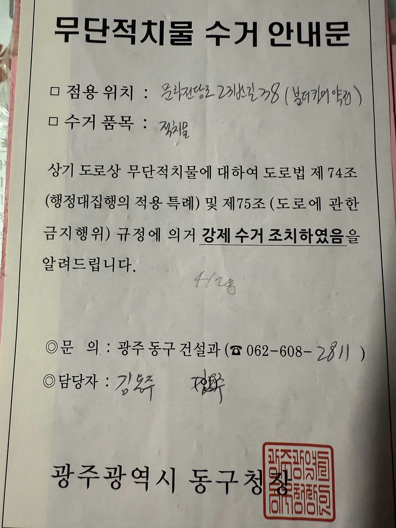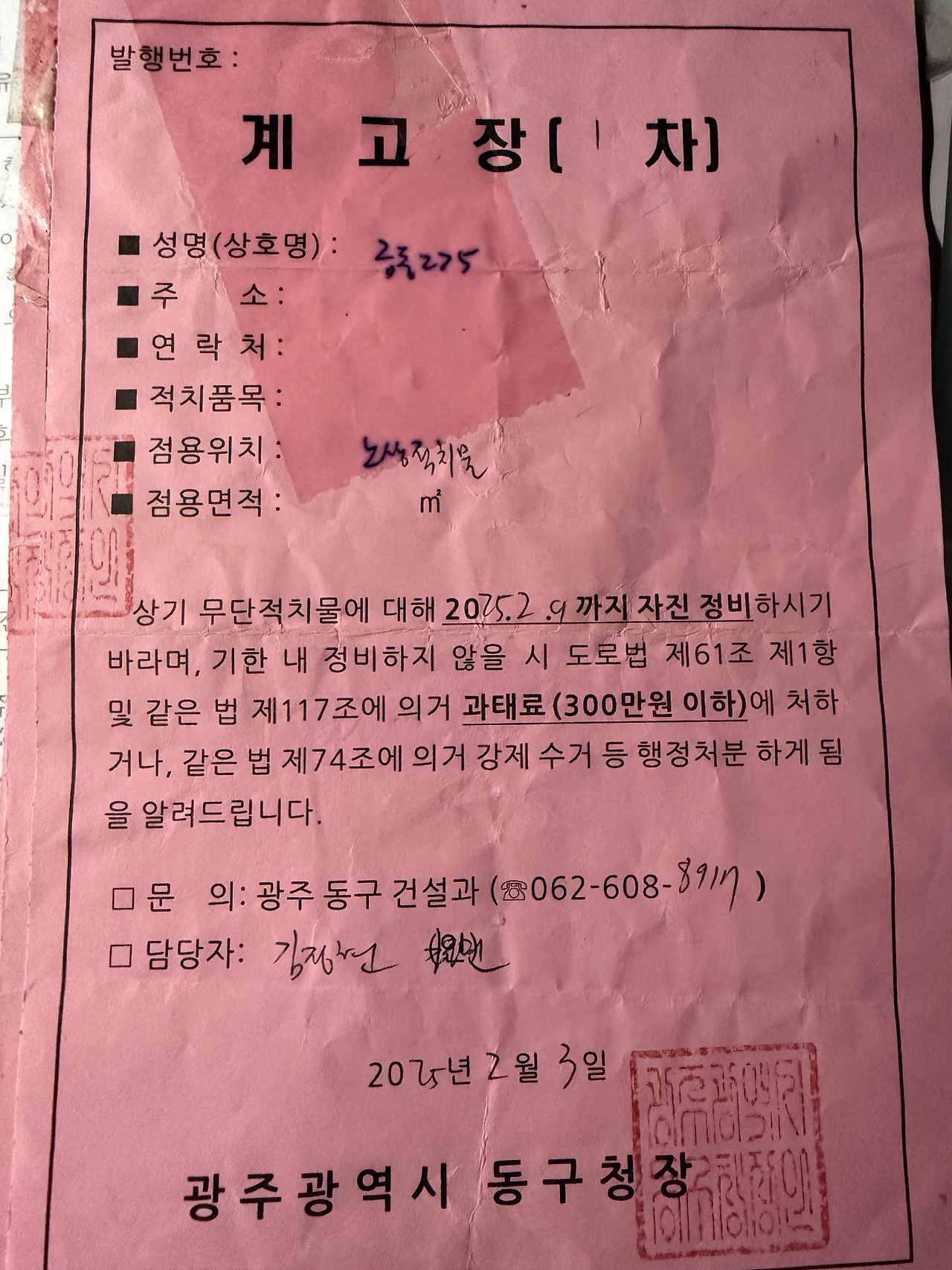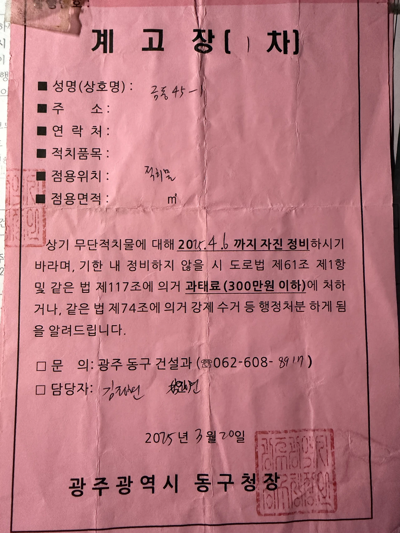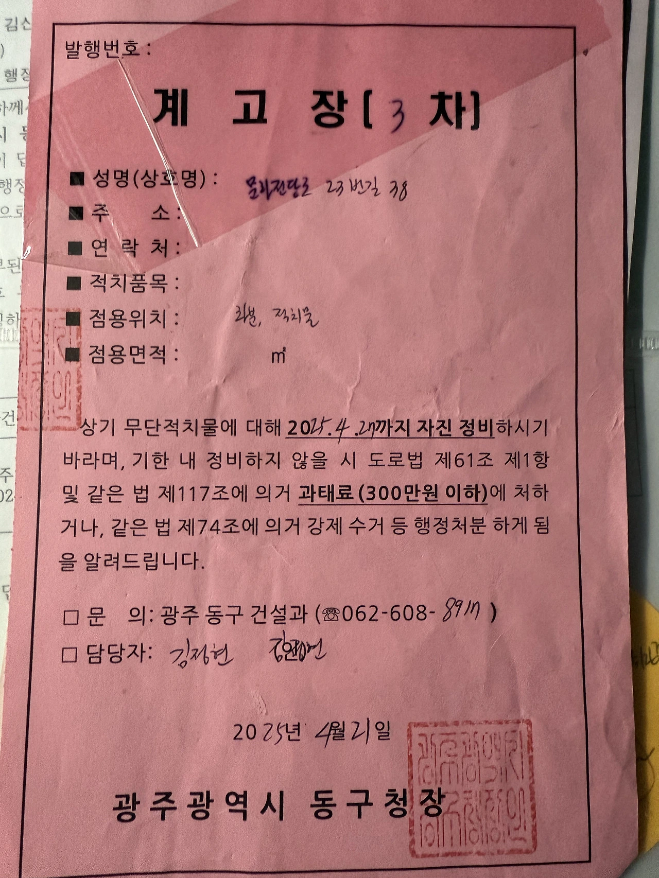 동구청 건설과 명의의 3차 계고장에는