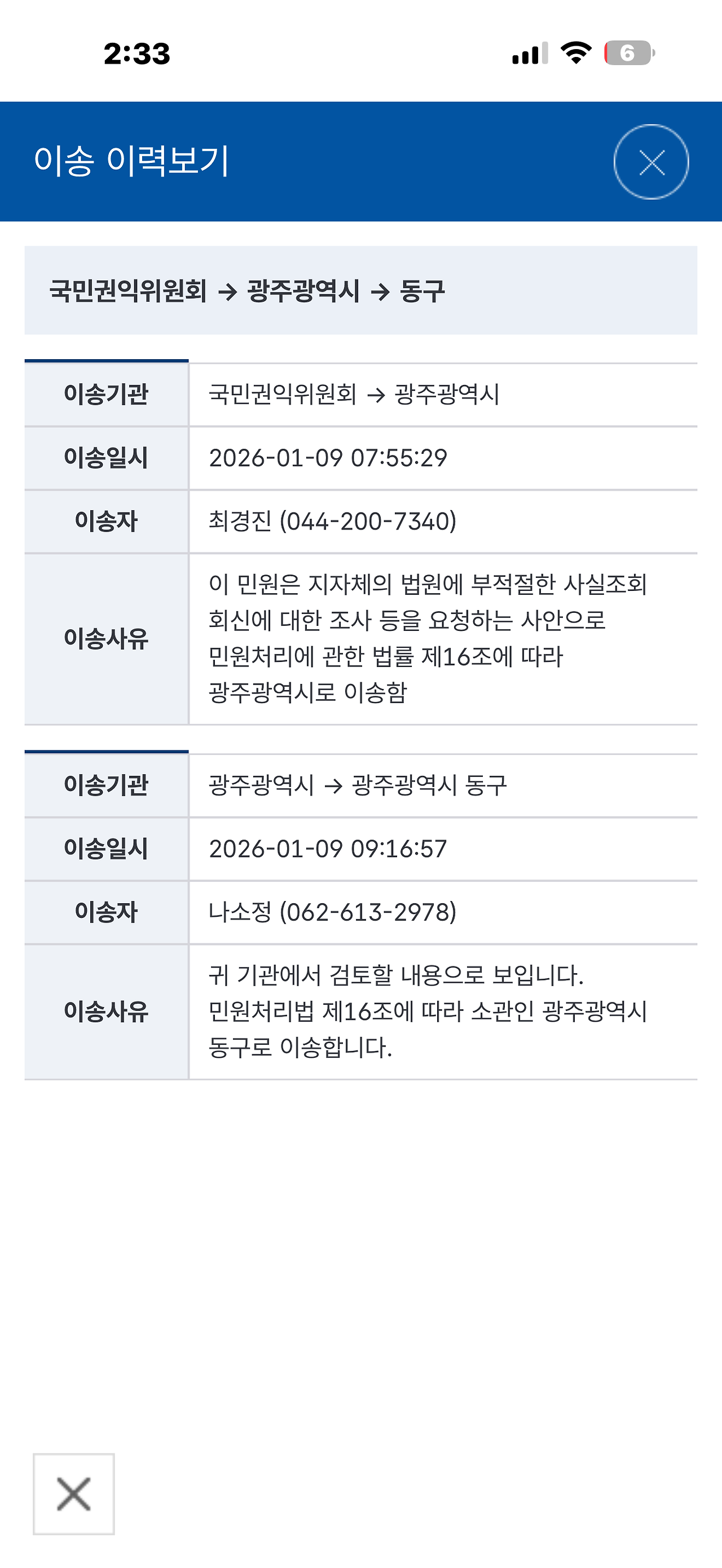 서류 부재에 대한 전화