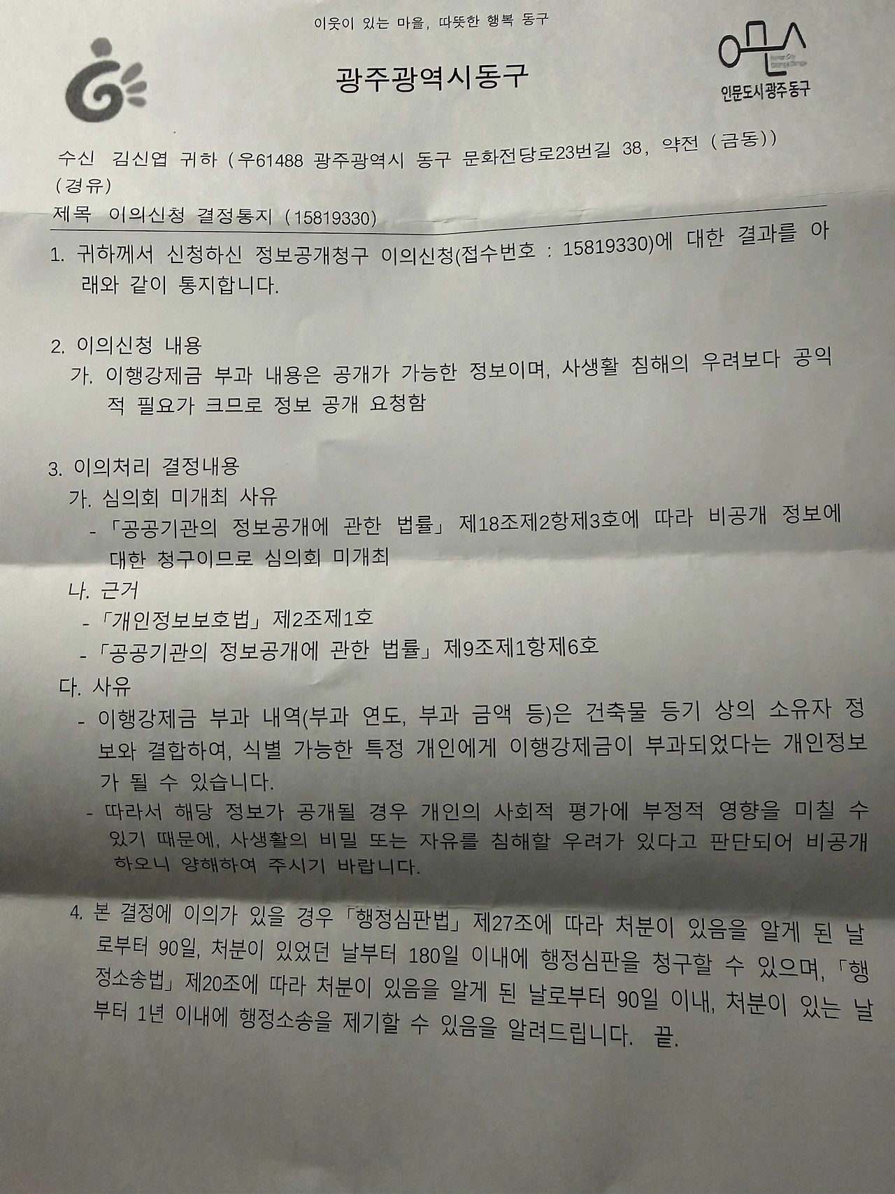 이의신청을 통해 정보공개를 요구했으나,