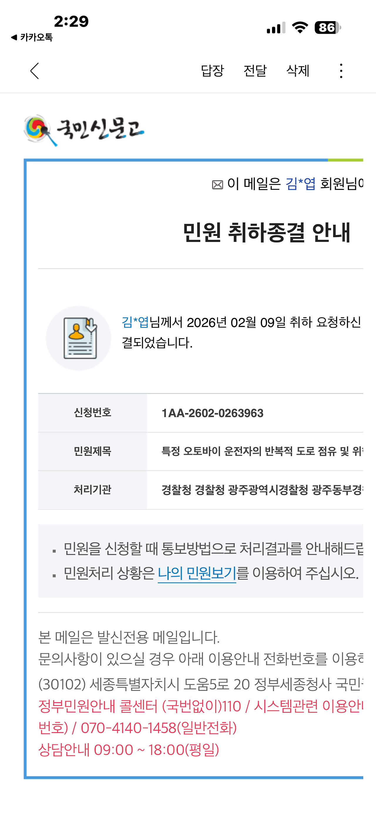 민원 처리 결과를 확인했다.