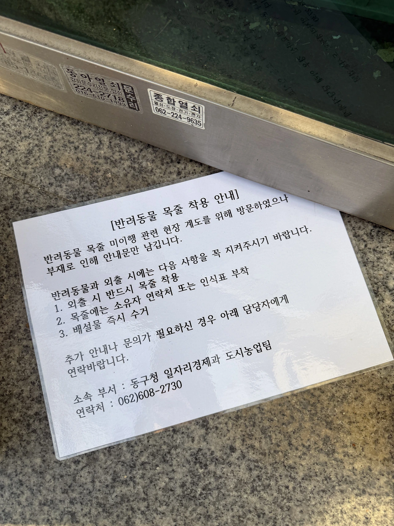 반려동물 목줄 미이행 관련 “현장 계도”를 위해 방문했으나 부재라서 안내문만 남긴다는 내용이었다.