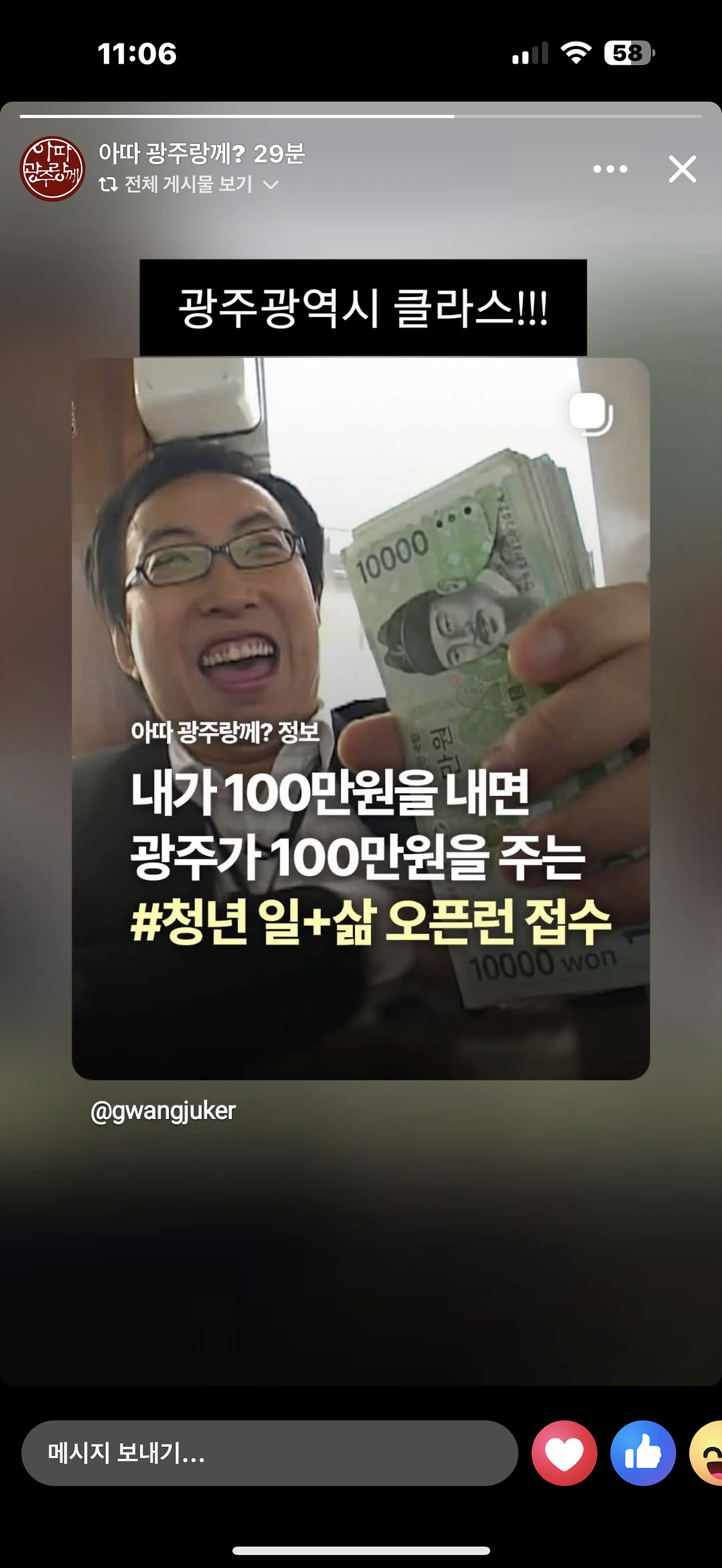광주가 100만 원을 다시 지원해 준다는 정책 안내다.