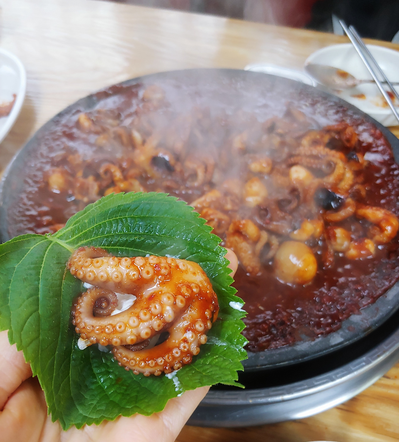 맨 입에 쭈꾸미를 넣어 맛을 본다. 첫인상이 잊히지가 않는다. 빨갛게 졸여진 게 매콤하고 쫄깃하다.