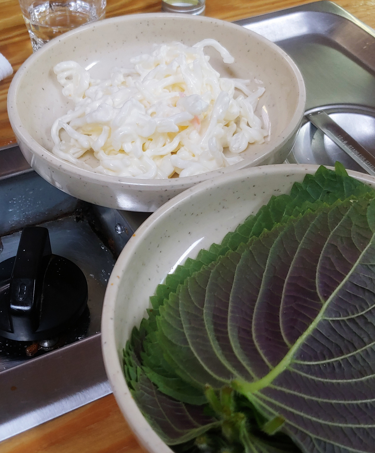 본격적으로 깻잎에 천사채무침과 함께 올려 먹는다. 맥주파인데 차갑고 맑은 소주가 맛있어진다.