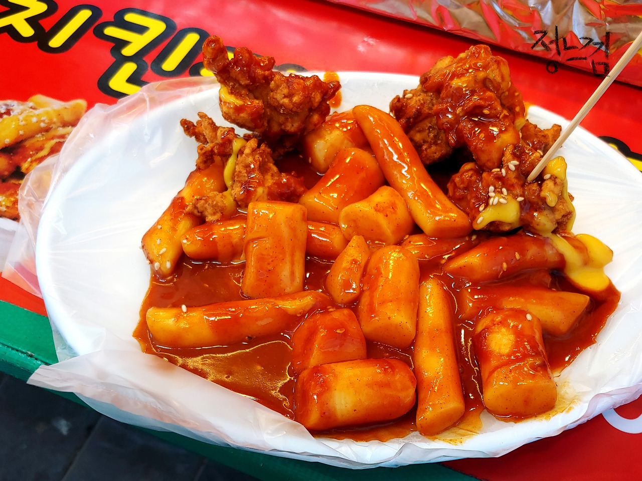 닭강정이 연상되는 순살치킨 한 컵 분량을 기름에 잠깐 튀겨 바삭하게 만들고 그 위로 떡볶이를 부어주신다. 마지막으로 허니머스터드소스를 치킨 위로 가볍게 흩뿌려 새콤함을 더해주고 내어주셨다. 손님들 간의 화합을 위해 밀떡과 쌀떡을 모두 사용하신다.