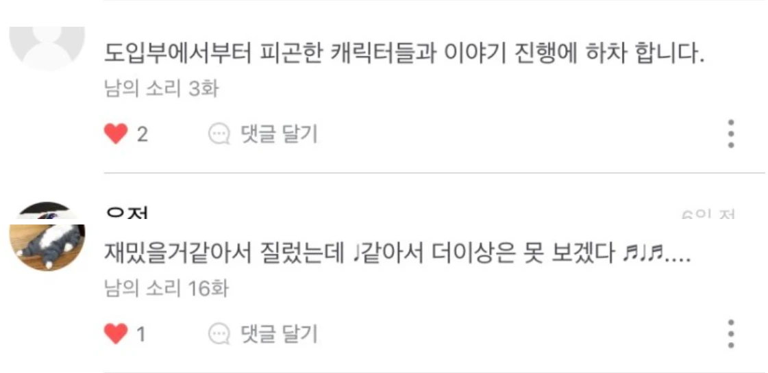 작품에 대한 독자들의 반응은 주로 댓글로 확인한다. 700여 개의 댓글 중 200개 정도는 분노와 짜증의 표현이었다. 독자들은 주인공에 대해 충분히 공감한 것처럼 보인다. 다만 잔뜩 화나는 기분을 공감하게 해서 그렇지... 독자들의 분노는 15만 조회수 대비 저조한 댓글과 중도 이탈로 돌아왔다.