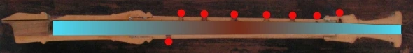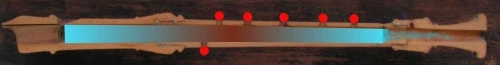 그런데 여기에서 구멍을 하나 열면 관의 길이가 짧아지는 효과가 나게 되며 음의 주파수도 높아진다. 즉, 7번 운지(악기의 가장 끝에 나 있는 구멍)를 열면 공기는 열린 구멍 사이로 빠져나가면서 열린 구멍까지만 공명하게 된다. 그러면 자연히 길이가 더 짧아지게 되어 더 높은음이 생성된다.(아래 사진) 하지만 구멍이 그리 크지 않으면 공기가 미처 열린 구멍으로 다 빠져나가지 못해서 조금 더 뒤로 밀리게 되고 음도 살짝 낮아진다. 아래 사진에서도 파란색으로 표시된 공기가 열린 구멍 뒤쪽으로 조금 밀려있는 것을 확인할 수 있다.