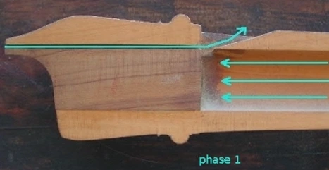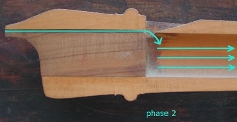 아래 사진은 실제 리코더의 단면 모습이다. 바람을 불어넣는 윗부분의 윈드웨이가 조금 더 넓고 아주 조금 곡선을 이루면서 아래로 내려올수록 좁아진다. 아래 라비움 쪽으로 나있는 윈드웨이 끝 부분에는 쳄퍼(chamfer)라 불리는 부분이 나온다. 이 쳄퍼는 위쪽 취구와 블록의 모서리를 조금 깎아 만든 것으로 공기의 흐름을 안정시킨다. 또한 쳄퍼는 음질과 아티큘레이션의 복잡한 조정을 위해 꼭 필요하다.