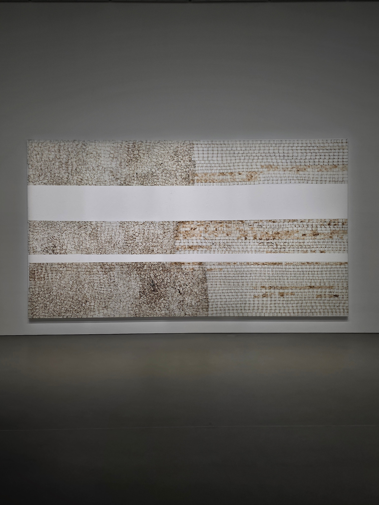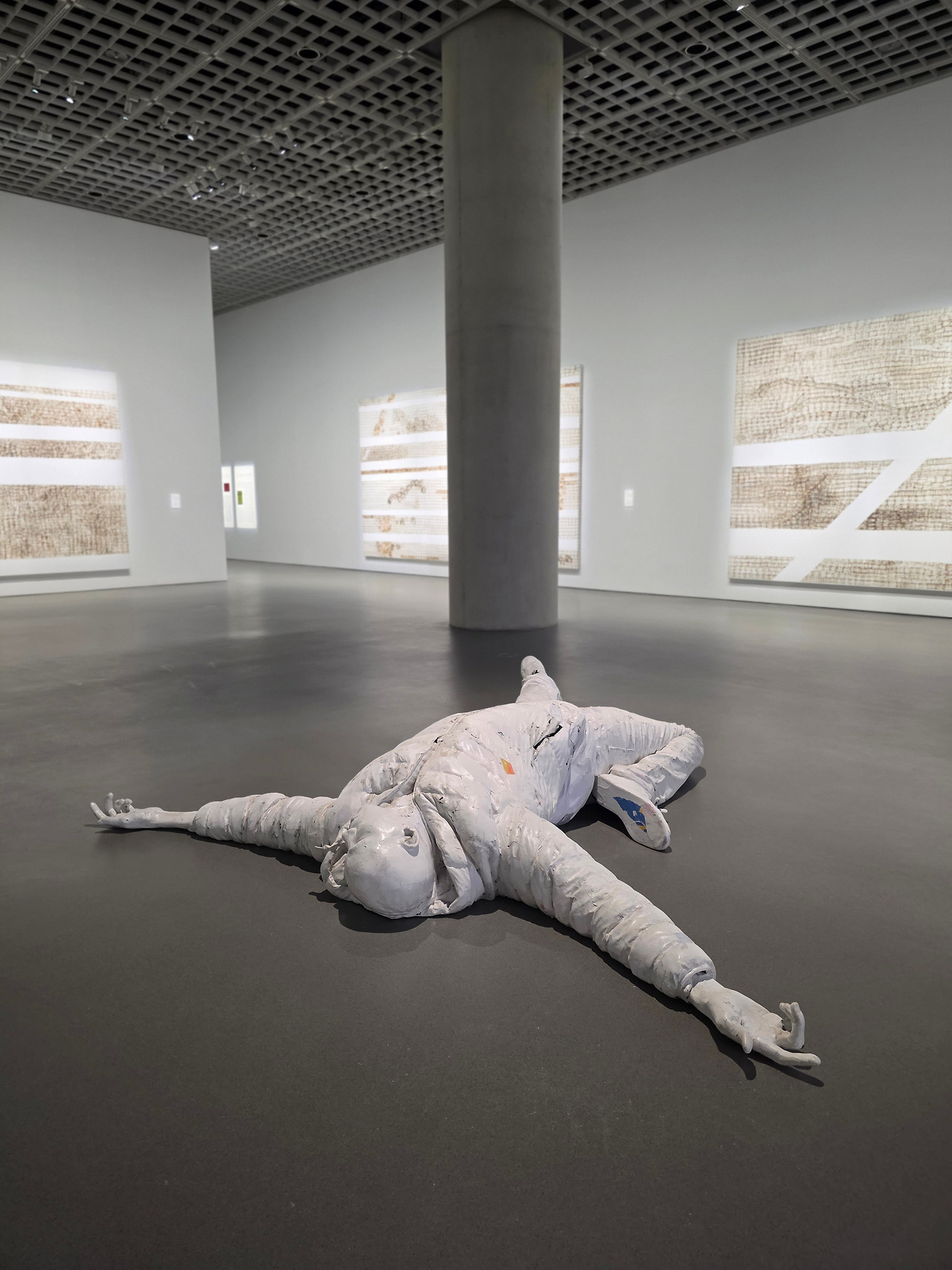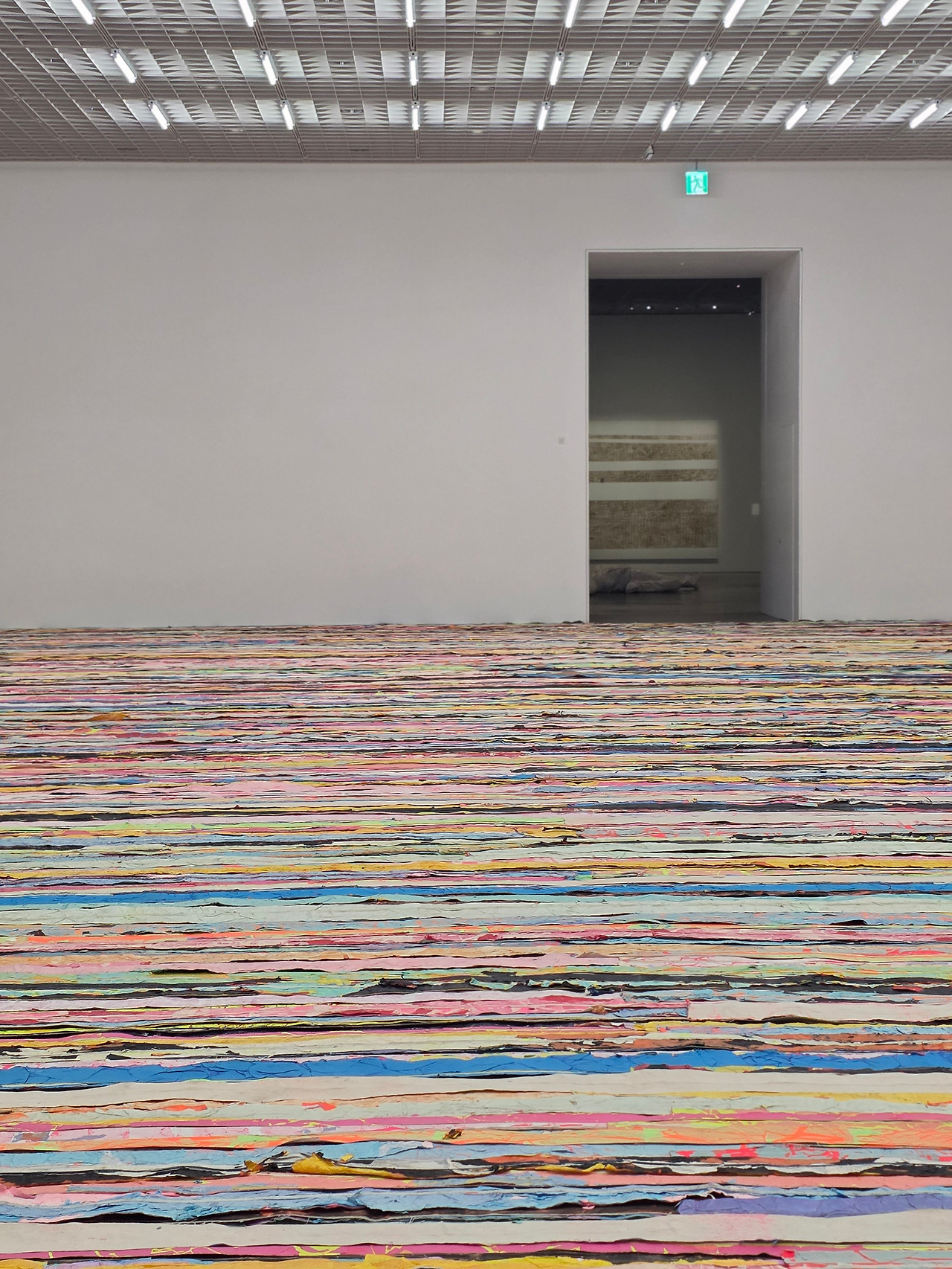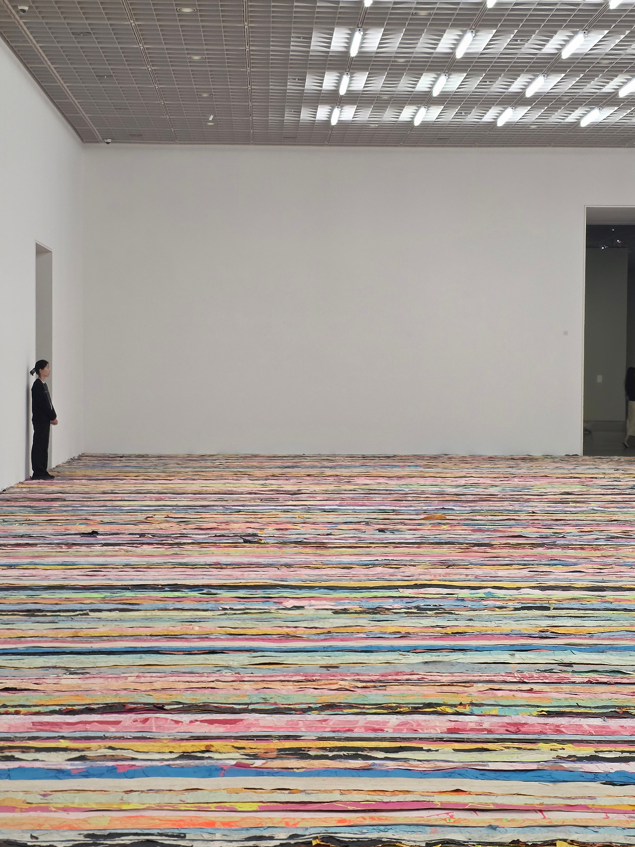 시작을 여는 대작 <떠오르다(float)>는 앞서 말한 ‘거리의 부산물’인 전단지, 신문, 포스터 등을 긴 끈으로 엮어 펼친 작품입니다. 알록달록하고 다소 거친 이 작품은, 아마 관람객이 지나다니며 밟고 밟을수록 점점 매끈한 표면을 갖게 되겠죠. 원래의 성별과 인종, 출신이 다양한 사람들도 결국 같은 땅을 밟고 사는 똑같은 사람들임을 이 회화적인 설치 작품을 통해 느낄 수 있습니다. 이 넓은 공간을 차지한 작품 위를 걷다 보면, 아마도 작가가 서서 눈으로 관찰했을 풍경들을 모두 발 밑에 두었다는 사실만으로 이런 전달력을 가질 수 있다는 것에 감탄하게 됩니다. 이렇게 다르고, 또 위에서 바라보면 그만그만 비슷한 사람들. 관람객의 시선을 위성의 눈처럼 두는 이 작품은 규모 뿐만 아니라 발상, 아름다움이 모두 압도적이어서 전시의 서두를 차지할 만합니다.