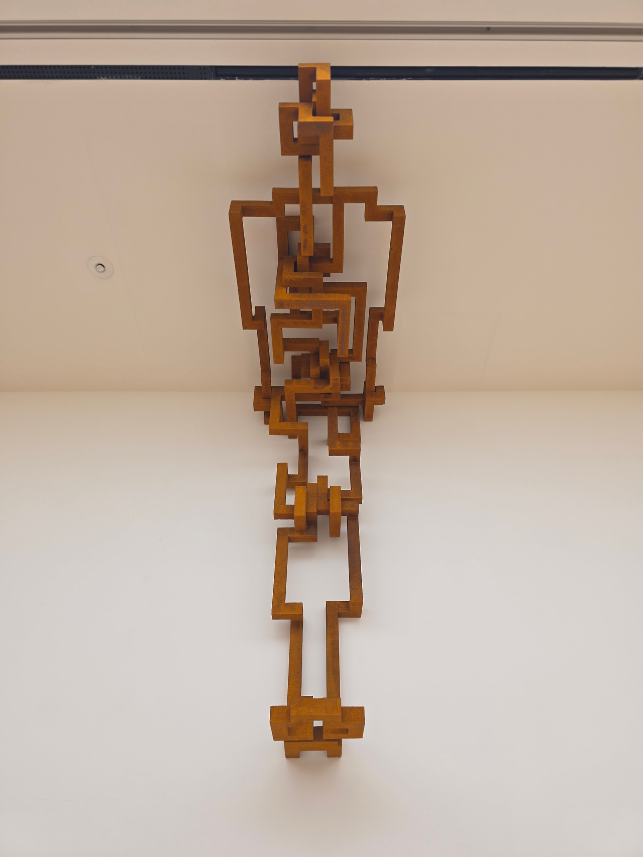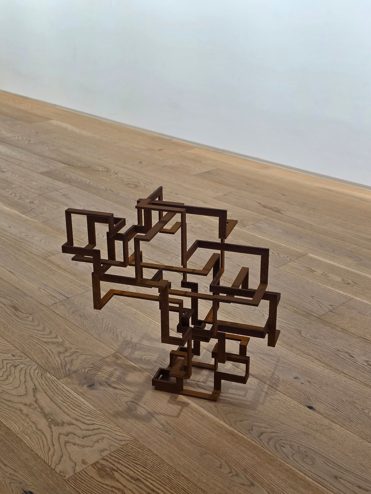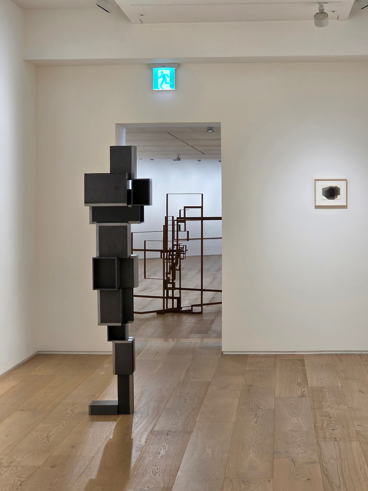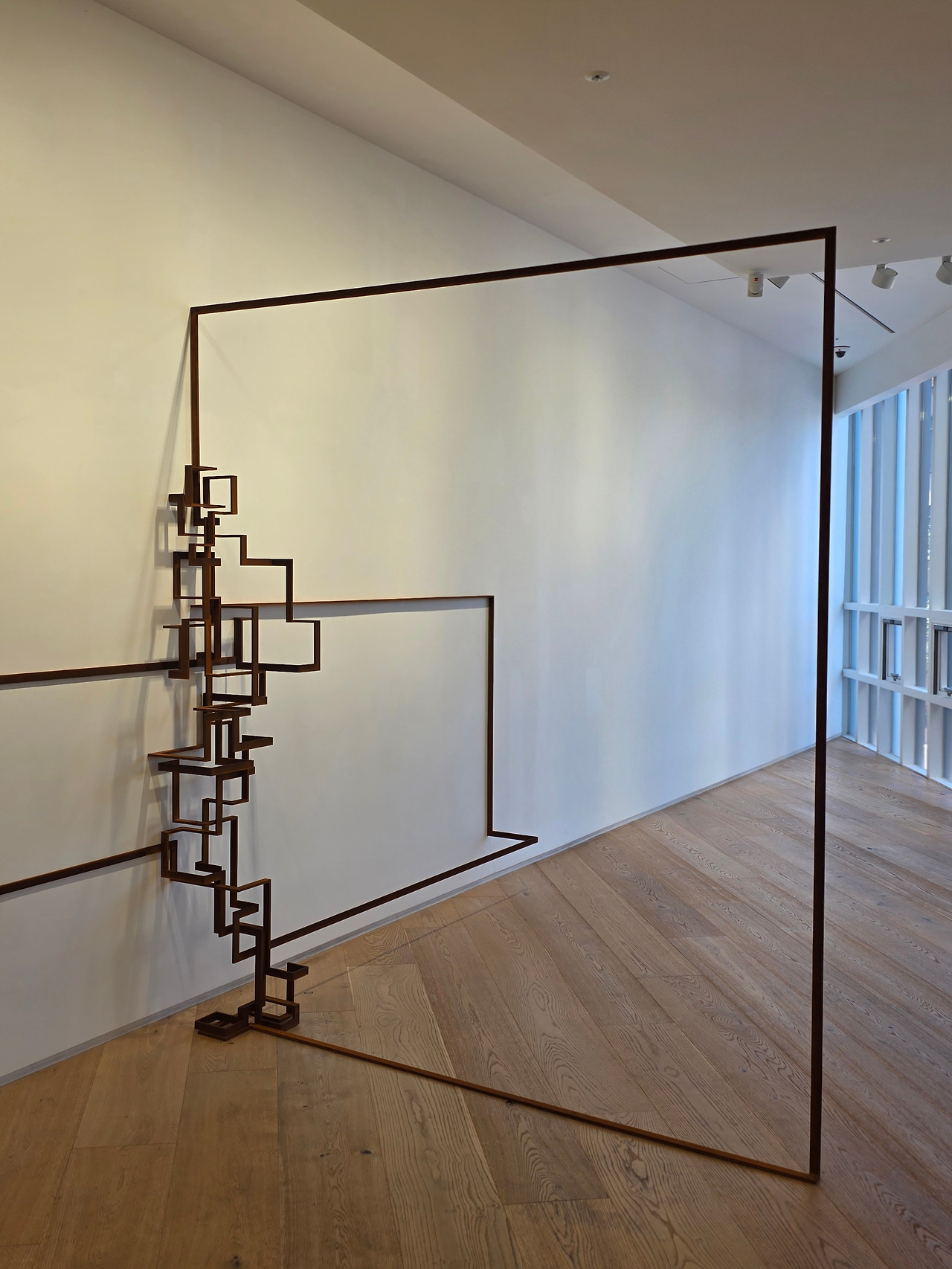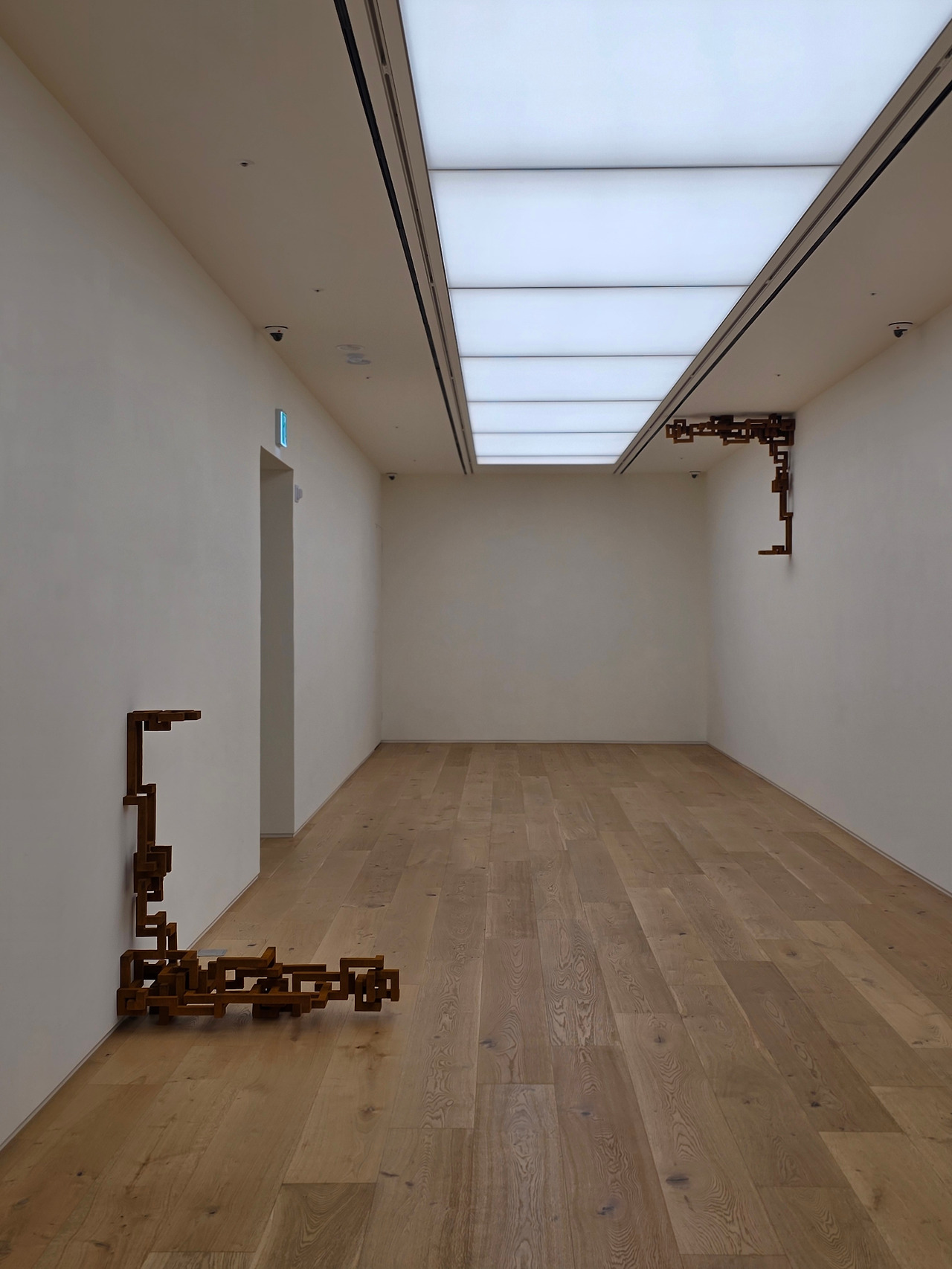타데우스 로팍에 전시된 작품들은 그래도 이 쓸쓸한 무드에 위트가 더해져 있습니다. 끝없는 자연 속은 아니지만 나름의 공간과 세상을 펼친 작품도 있고, 천정에 붙어 관람객을 맞이하는 작품도 있습니다. 얼핏 보면 속이 빈 큐브들이 포개져 있는 것 같지만, 무한루프럼 구불구불한 선들이 인체를 이루고, 이를 멀리서 보면 공간을 이루는 선들과 하나로 이어져 보입니다.