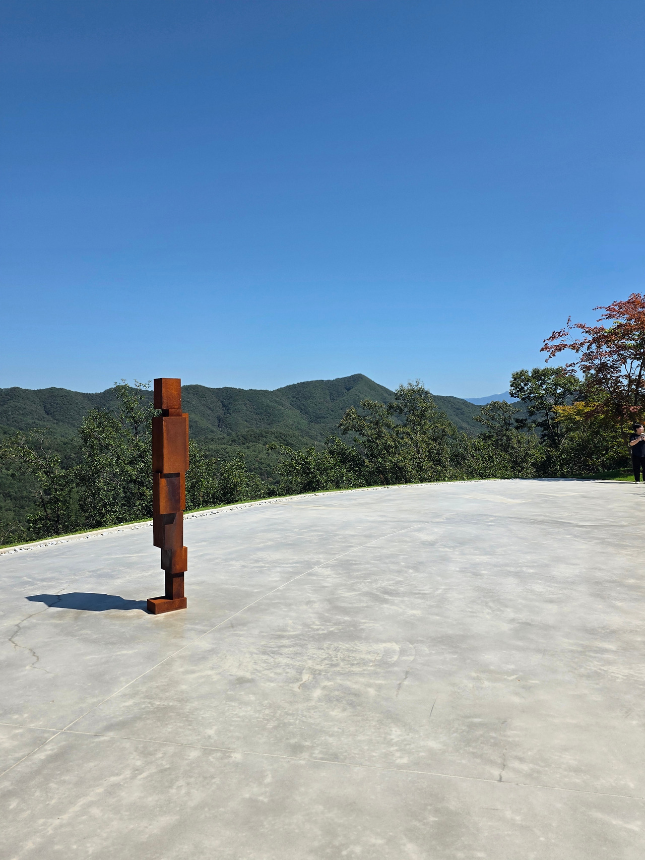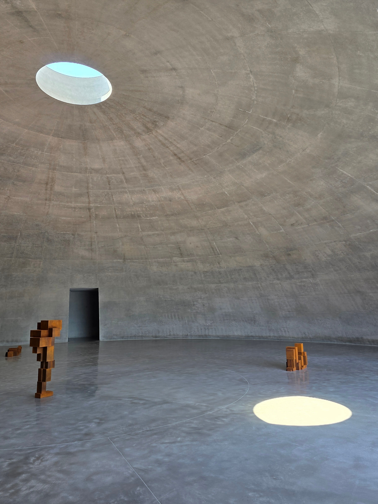 거대한 돔 형태의 공간에 햇볕이 쏟아지는 구멍, 햇빛의 움직임에 따라 각도를 달리하며 빛이 들어오는 광경을 가만히 응시하는 듯한 몇 개의 작품들. 그리고 그 돔의 트인 부분을 통해 총천연색의 초록과 파랑을 병풍삼아 선 작품들을 보는 건 말 그대로 장관이었습니다. 사람들은 작품 옆에 작품과 비슷한 포즈로 앉아 보기도, 누워보기도, 가만히 명상하기도 하면서 자유롭게 관람할 수 있습니다.