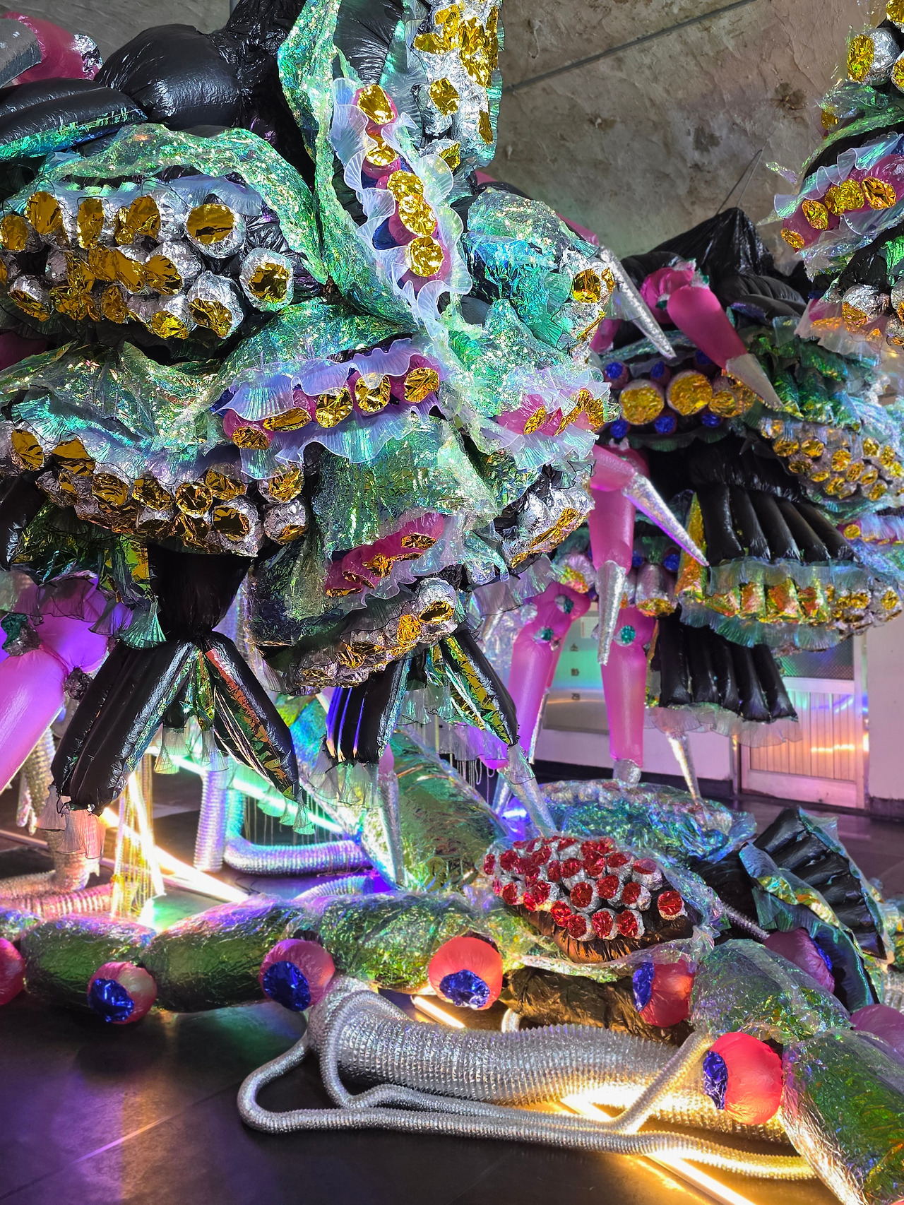 이병찬 작가의 <플라스틱 유기체>는 가장 배신감을 준 작품으로 기억에 남았습니다. 작품마다 일정 거리를 두고 있기에 다음 작품 공간으로 가면서, 이 작품에 도달하기 전까지 이곳에서는 뭔가 잔잔하고 아름다운 자연 친화적인 풍경이 펼쳐질 줄 알았습니다. 이파리 부딪치는 소리와 그 사이로 스치는 바람 소리, 어떤 생명체가 숨 쉬는 듯한 소리가 들려왔기 때문이죠. 그런데 발견한 것은... 비닐과 잡동사니로 이루어진 큰 인공 생명체였습니다. 이파리 부딪치는 소리는 비닐끼리 스치는 소리였고, 들숨과 날숨 소리는 그 생명 없는 생명체가 내는 소리였죠. 이 배신감 때문에 이 시대의 생명이란 무엇인가, 다시 한번 생각하게 됐습니다.