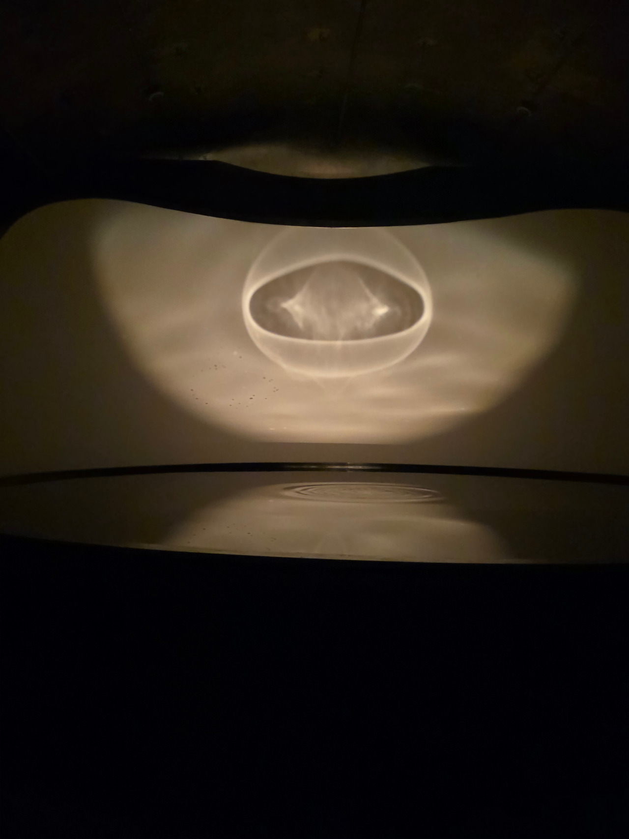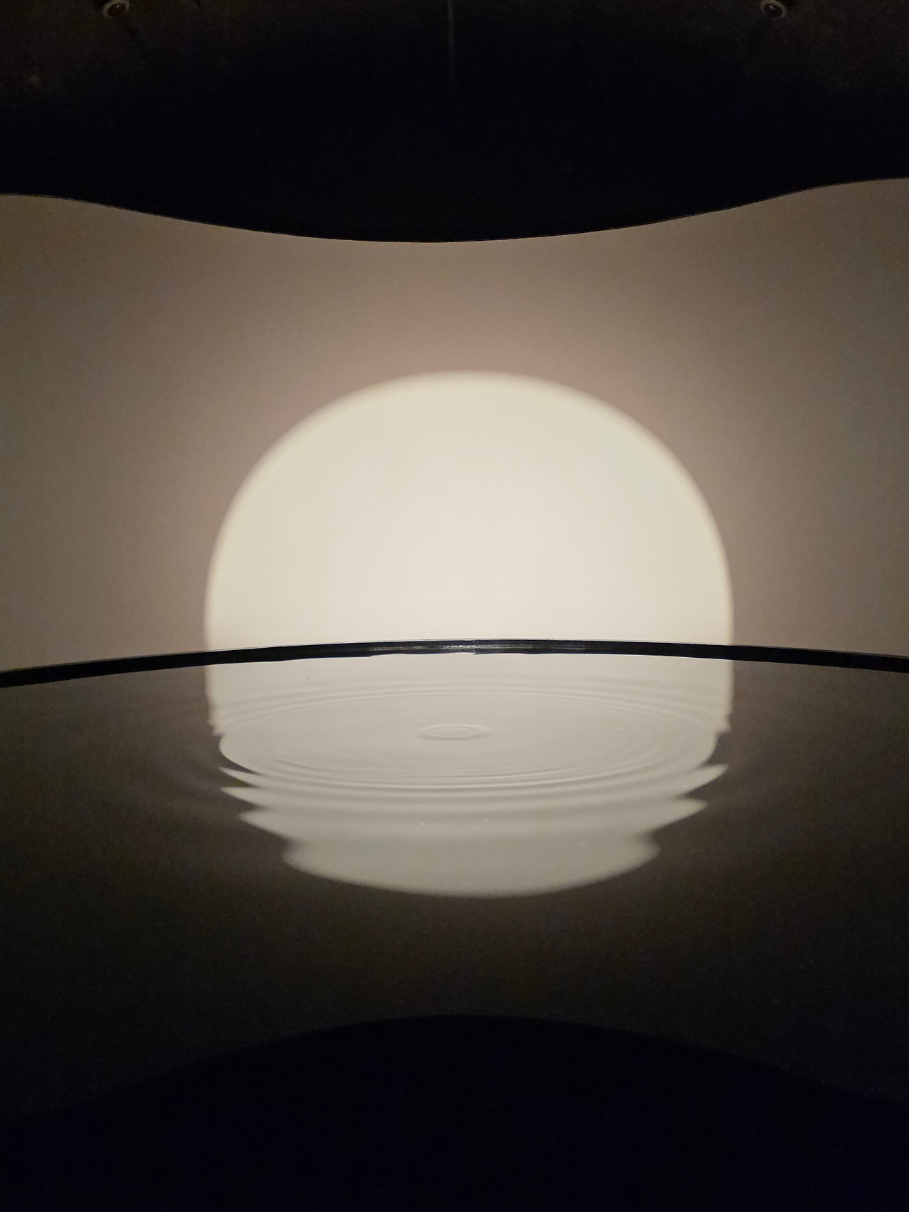 <파동>은 들어서자마자 전시 후반부를 맞이해서인가, 달과 가장 가까운 지구에서 대보름을 맞이한 기분으로 보게 되었습니다. 다시 작품의 처음으로 돌아가면, 스크린에 비치는 물의 파동으로 고요하게 시작된 영상이 한 두 방울 떨어지는 물을 따라 파문을 그리며 흔들리기 시작합니다. 이때 물은 실제로 어디서 떨어지는 것인지, 수면 아래의 장치를 통한 것인지 알 수 없는데 사실 별로 중요하지 않습니다. 그것을 가만히 바라보는 것만으로도 어느새 명상에 젖어들게 되기 때문이죠. 물 그림자와 환한 달빛에 탄성을 내뱉으며 들어온 관객들을 금세 수행자의 마음으로 돌려놓는 이 작품, 정말 멋있었습니다. 뜨면 지게 되어있는 자연의 순환과 덧없음도 함께 느낄 수 있었죠.