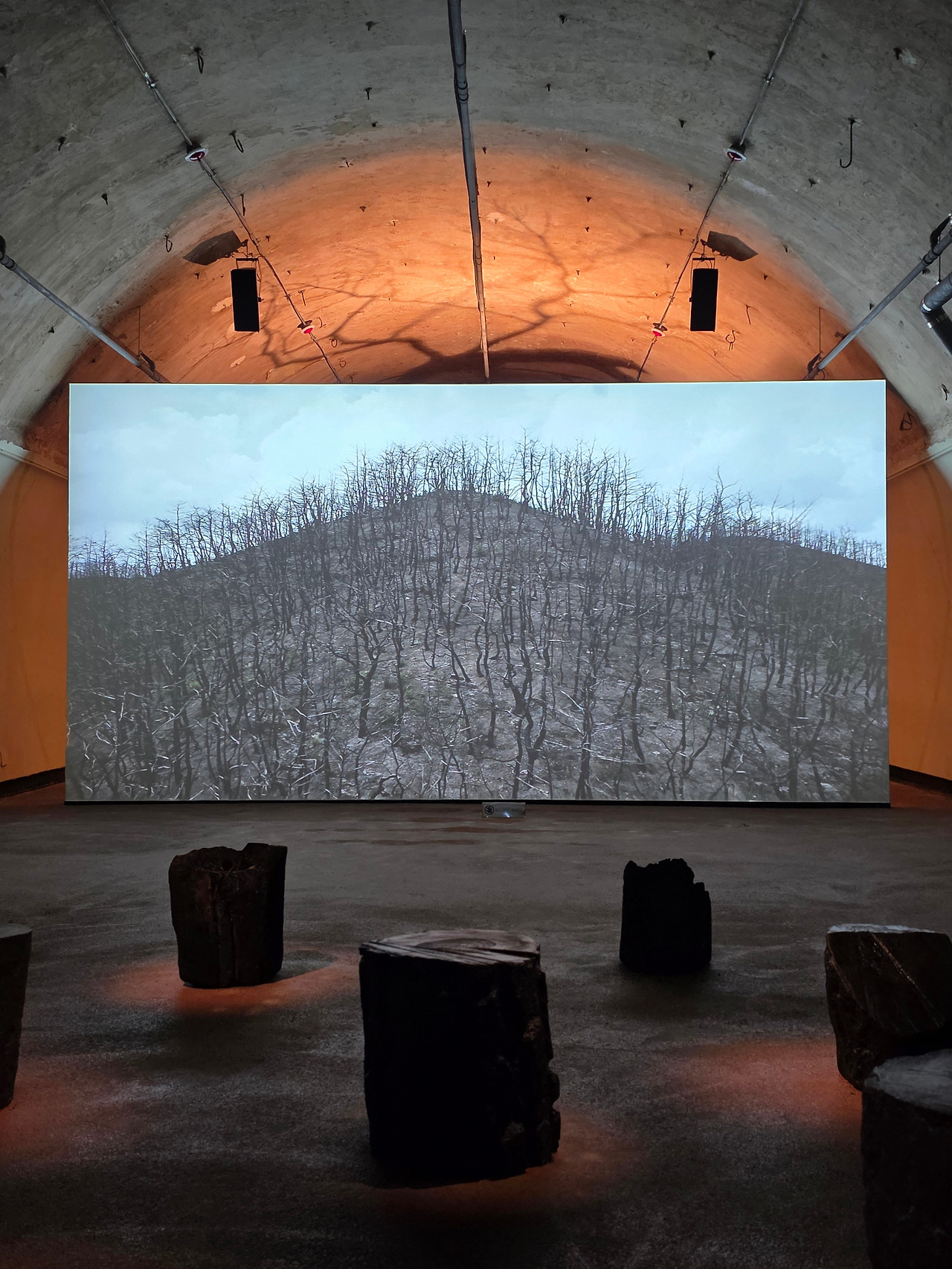 한편 시각예술가 장민승과 작곡가 정재일이 결성한 프로젝트 그룹의 <상림>이라는 작품 또한 인상적입니다. 이 영상은 다섯 이야기로 이루어져 있고 러닝타임이 꽤 되기 때문에 전체를 다 보지는 못했습니다. 전시공간으로 들어서자마자 잘려 나간 통나무로 만든 관람석과 스크린에 비친 앙상한 나무가 이룬 또 하나의 숲을 보는 것만으로도 가슴 한 켠이 잘려 나간 기분이 됩니다. 상림은 신라시대의 인공 숲 ‘상림’에서 착안한 것인데, 화면의 황량한 숲은 경북 산불 이후의 숲을 촬영해 이곳에서 새로 피어나는 생명을 비춘 것입니다. 또한 직접적으로 생명의 의미를 부각시키는 어린이들의 담백하고 아름다운 연주가 영상미를 고조시킵니다. 이 작품은 미술 작품이라기보다 영화 한 편에 담긴 종합예술에 가까운 느낌입니다. 스크린 뒤로 비치는 나뭇가지와 관람석까지 하나의 풍경이 되어 이 작품을 완성해 여운이 긴 한 컷의 기억을 남깁니다.