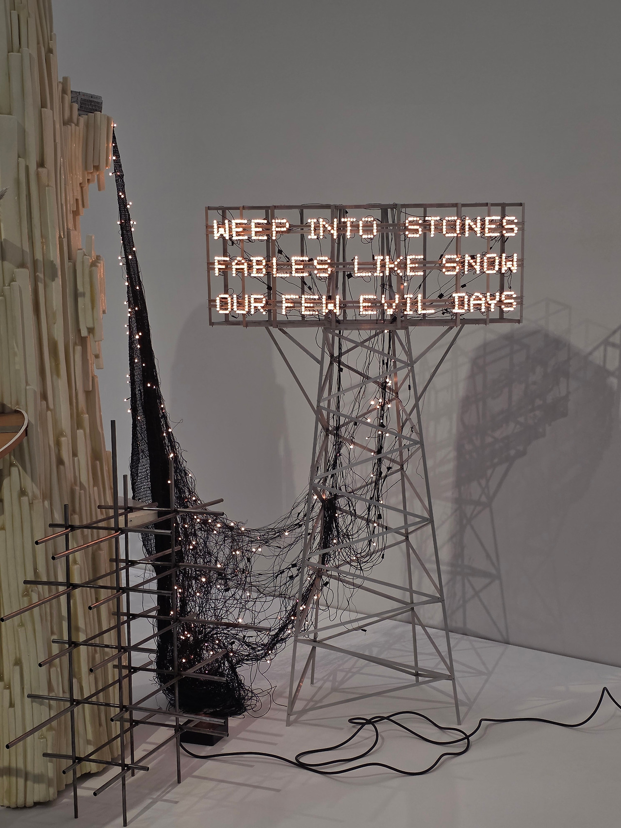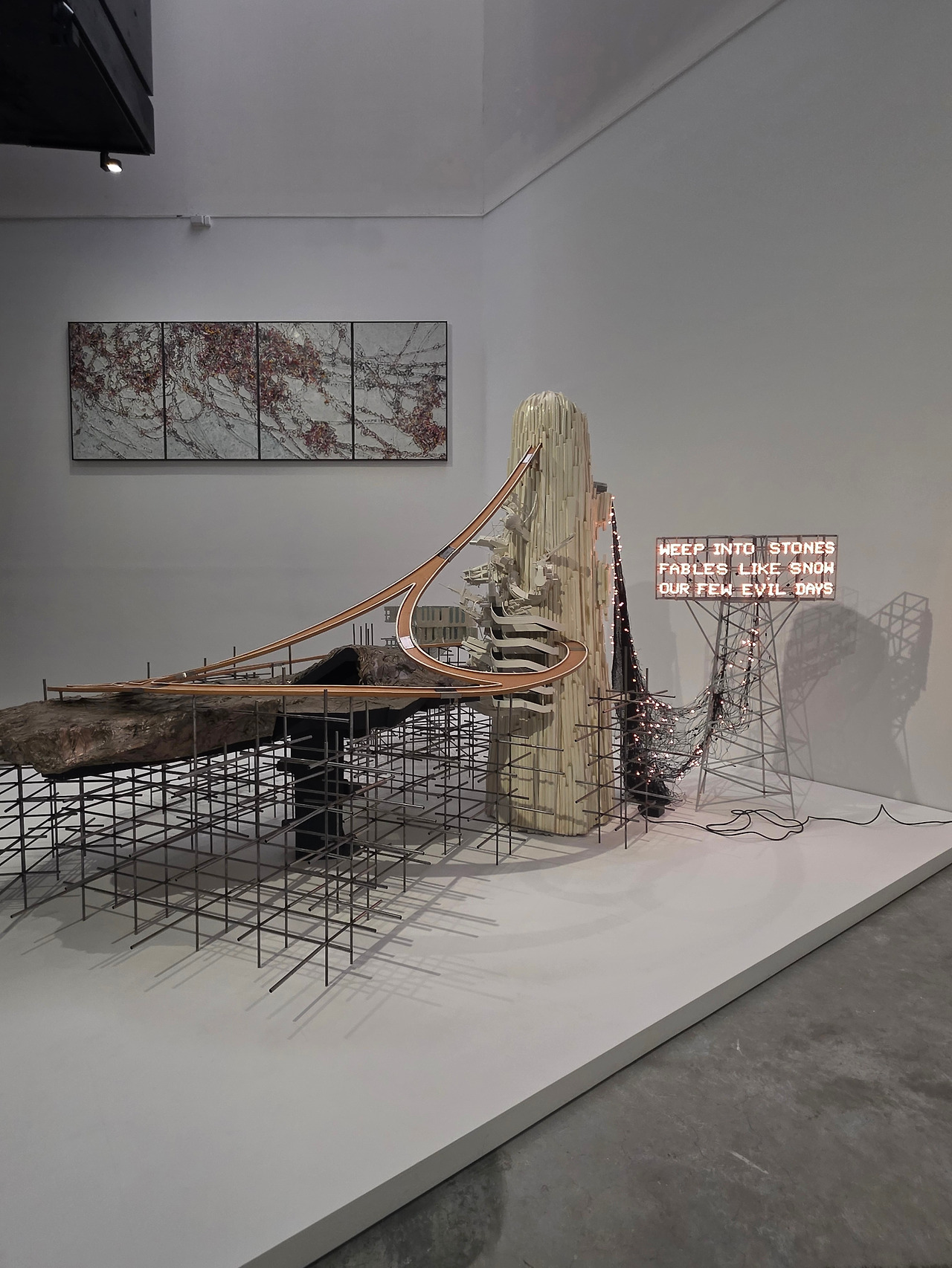 <몽그랑레시: 바위에 흐느끼다>라는 작품은 아이와 갖고 놀던 자동차 트레일 장난감과 비슷한 모습을 하고 있습니다. 자세히 보면 조금 복잡한 구조입니다. ‘몽그랑레시’는 한 철학자가 말한 ‘거대서사의 붕괴’라는 뜻을 가지고 있다는데, 가느단 철근 여러 개 위로 바위가 얹어져 있고, 그 위로 길이 그럴 듯하게 위치해 있지만 서로 통하지는 않는 것 같습니다. 대단한 것을 건설하려다 실패한 하나의 풍경 같습니다. 그럼에도 이렇게 아름답다는 건 아이러니입니다. 작가는 한국 근현대사와 다양한 나라의 건축을 참조해 이런 작품을 만들어냈다고 하는데요. 저는 내 기억 속의 구조를 뜯어보면 이런 모습이 아닐까 하는 생각도 해봤습니다. 실제로 일어난 일들이 시간 순으로 열거되지 않고 여기저기 구멍 난 채 주관에 의해 얼기설기 엮어진 모습. 그 자체로 거대 서사는 무너지고 사사로운 기억만 남은 어설픈 형상의 내 머릿 속 기억을 말하는 것 같습니다.