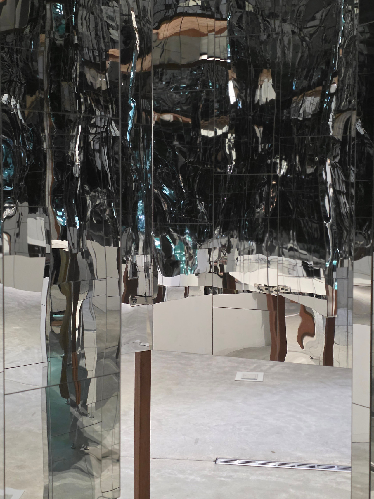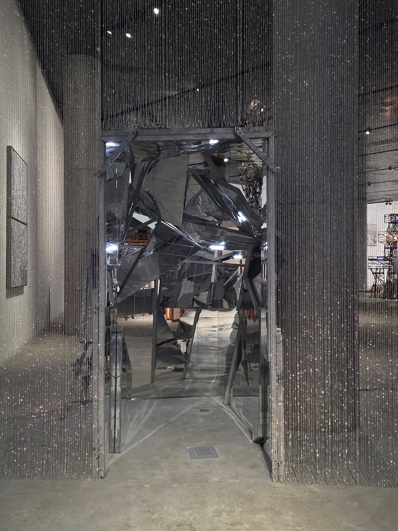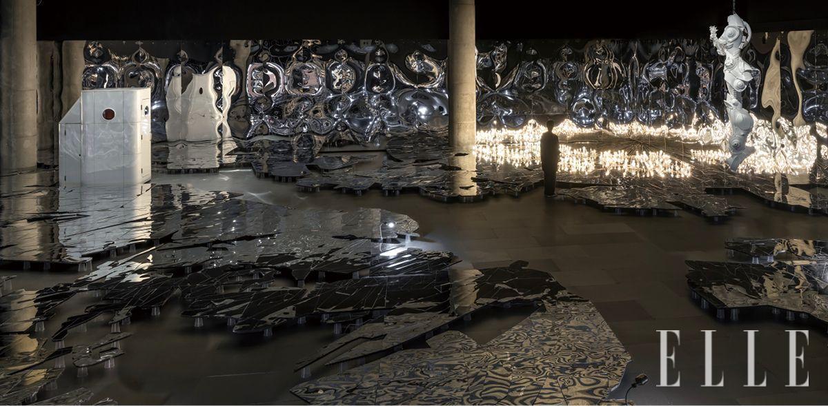 입구를 지나 블랙박스 전시실에 들어서면 거울이 가득한 어둡고 큰 방을 마주하게 됩니다. 이 곳에서는 사진 촬영이 금지 되어 있습니다. 사진을 찍다 떨어뜨리면 거울이 깨지고 작품이 훼손될 수 있기 때문이리라 생각해봅니다. 실제로 걸어 다니는 것만으로 조금 조심스러웠습니다. 거울 속에는 현재의 내가 있고, 그런 내 머리 위와 곁에 미래적인 작품들이 있고, 미세하게 과거에서 온 빛들이 반사되어 빛나고 있어 다소 혼란스럽습니다. 그럼에도 빛나는 조명과 반사광들은 너무나 아름다워 슬픈 느낌마저 듭니다. 여러 시점이 뒤섞인 그 순간이 영원하다는 느낌이 아니라 찰나로 느껴져서였습니다.