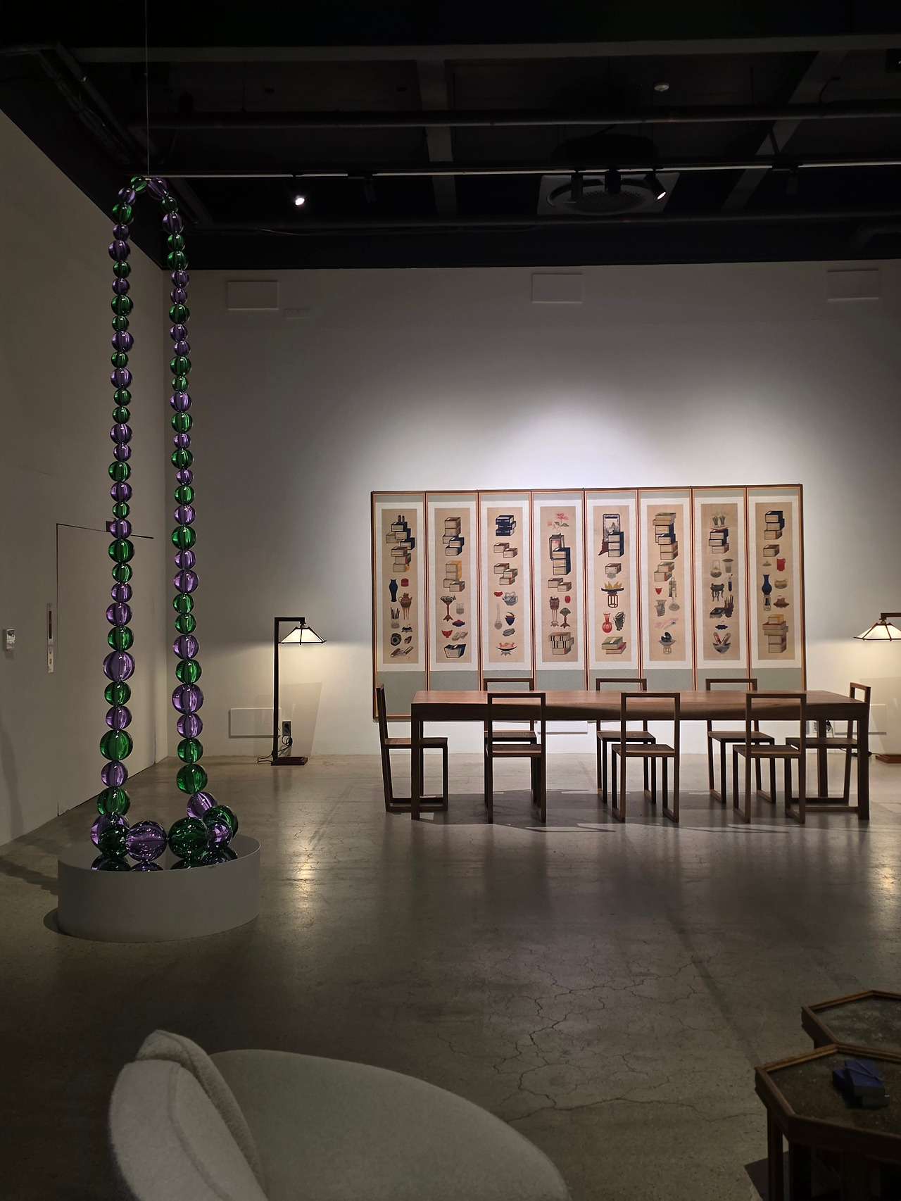 그 외에도 전시 공간의 각 섹션에는 거장들의 작품과 가구가 어울려 빛을 발합니다. 오토니엘의 유리구슬은 알 하나의 빛만을 바라보아도 시간이 잘 갈 것 같고, 길게 기대어 앉을 수 있는 의자에 앉아 책을 읽으면 까무룩 잠이 잘 올 것 같습니다.