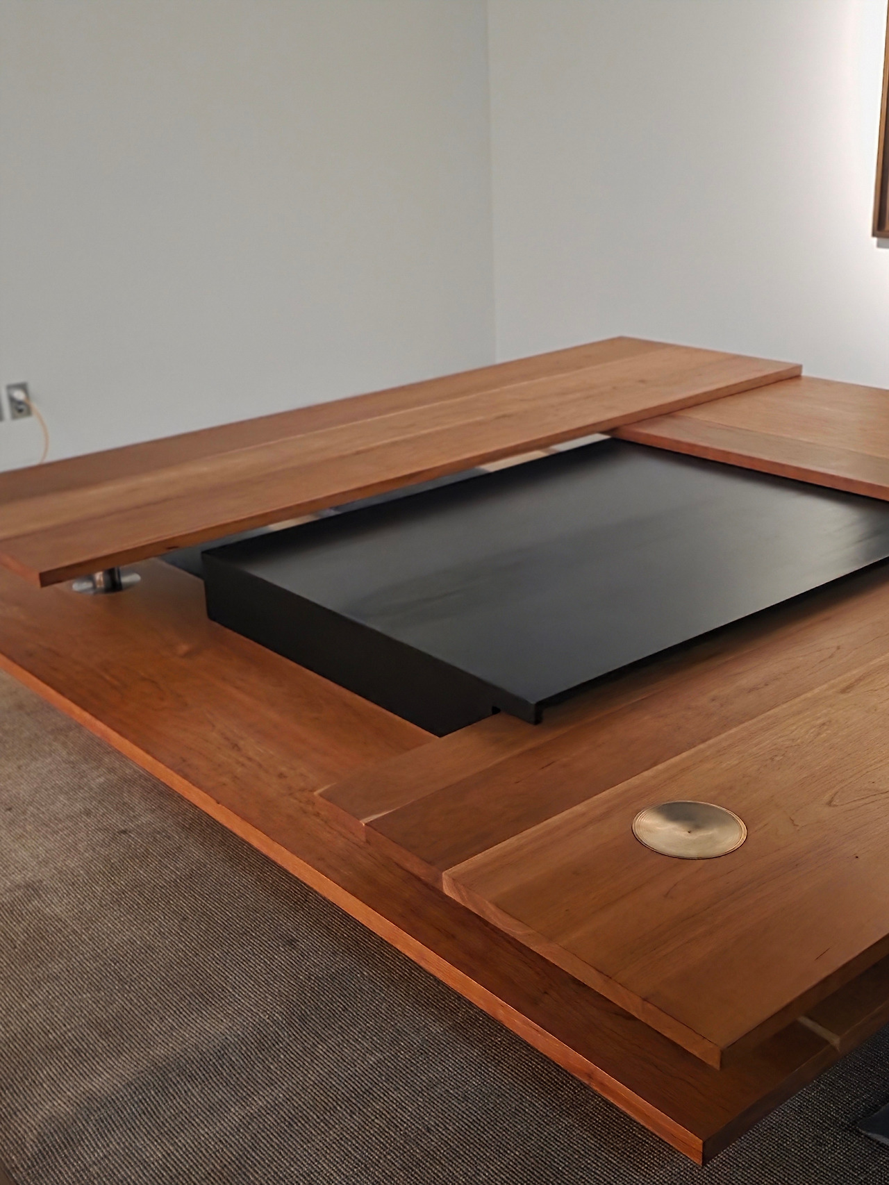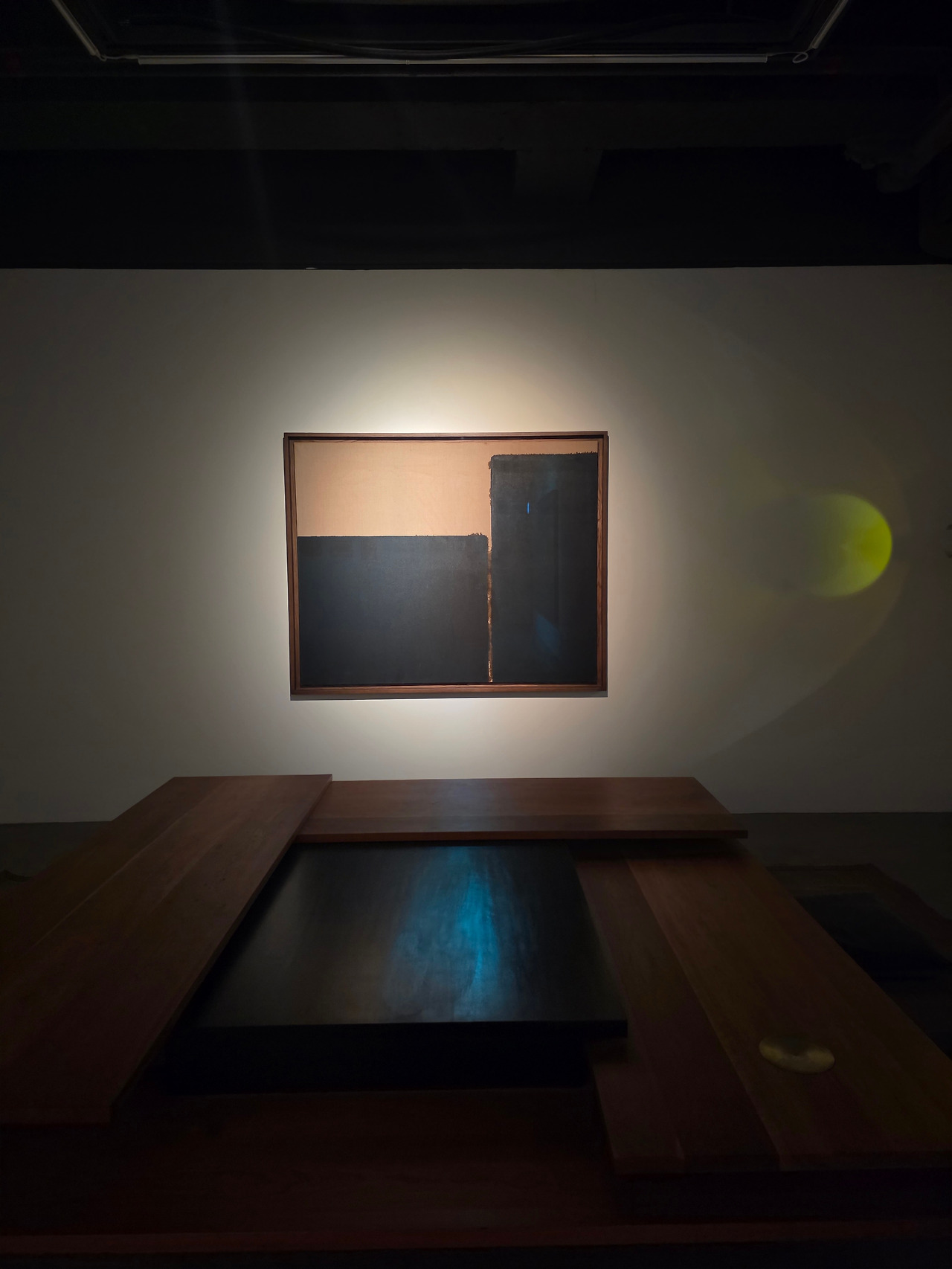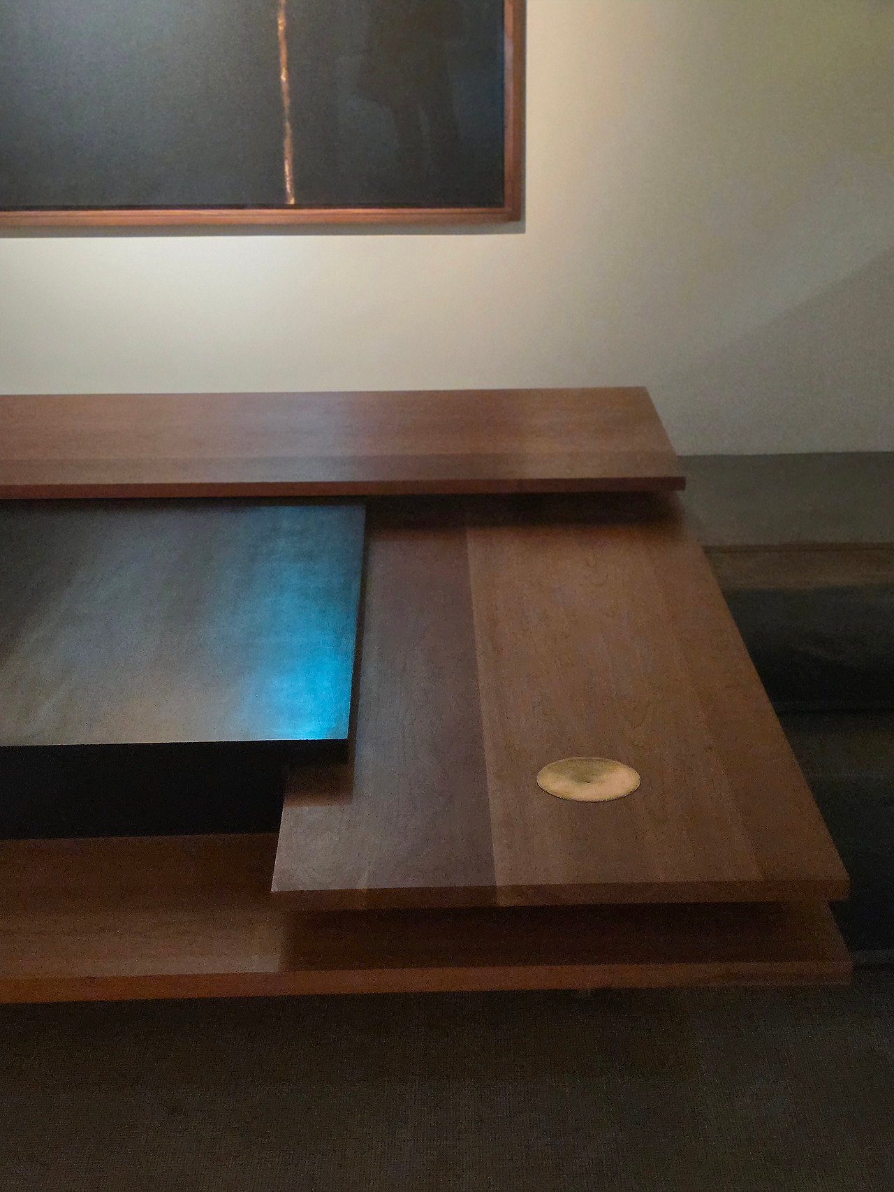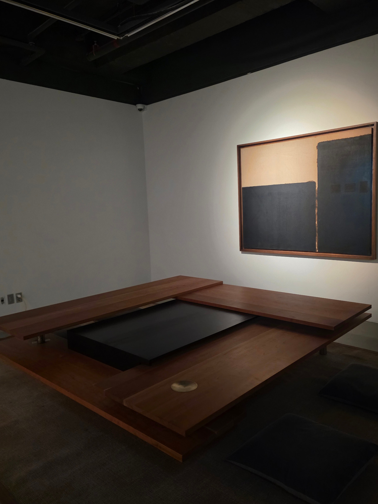 윤형근의 묵직한 작품 정면으로, 목재가 층층이 한 끝을 맞대고 계단을 이루는 작품입니다. 오르내리는 계단이 무한히 이어지는 느낌이지만 이것이 ‘테이블’이라는 점을 생각하면, 윗사람이 당연히 가장 위에 앉아야 할 것 같습니다. 계단임에도 불구하도 어딘가 ‘오르내림이 금지된’ 느낌을 가진 아주 냉소적인 가구입니다. 한편으로 바꿔 앉으면 그만인, 언제든 전복될 수 있는 것이 권위와 인간관계라는 메시지도 내포한 듯합니다. 모양새와 소재가 주는 기품이 오히려 완고함을 드러내는데, 그 점 때문에 오히려 여러 상상이 가능한 재미있는 가구였습니다. 가구를 보고 뒤를 돌아보면 기생충에 등장한 이 가구의 모습을 사진으로 만날 수 있는데, 영화 속 인물들의 캐릭터와 앉은 위치를 매칭해 보면 흥미로움이 배가됩니다. 재치 있으면서도 품격 있는 가구죠.