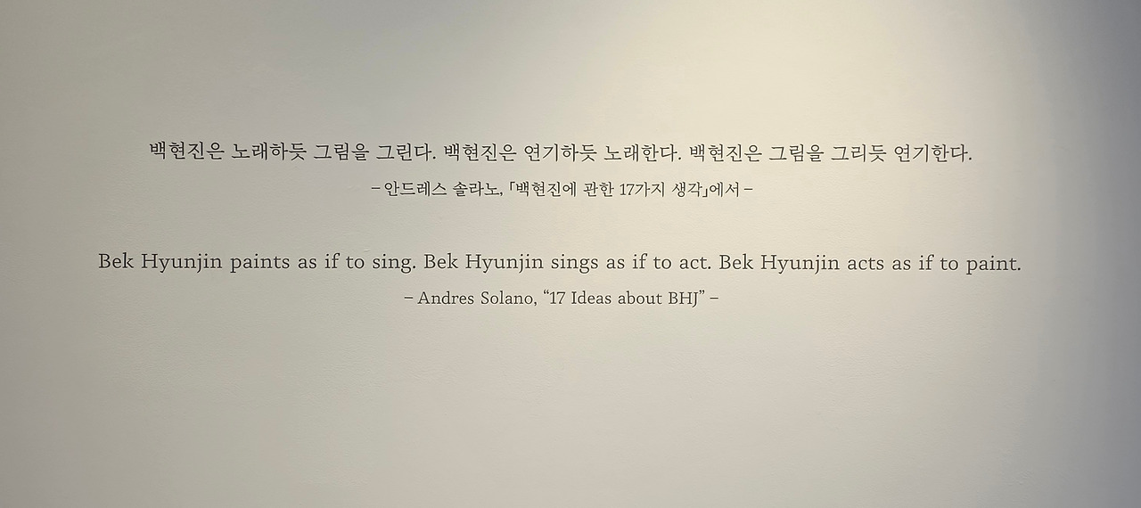 전시와 하나도 관계없는 사람에 대해 자꾸 말을 늘어놓는 이유는 나에게 백현진(여기서는 작가라고 해야겠다) 역시 그런 사람이기 때문이다. ‘어어부 프로젝트’라는 밴드로, ‘방백’이라는 프로젝트 그룹으로 음악 활동을 하더니, 어느새 연기자가 되어 있었던 그. 실은 도대체 저 사람은 몇 살인데 몇 년째 같은 나이로 보이는 걸까 싶었다. 이제는 한 OTT 프로그램 ‘직장인들’에서 안 웃긴데 웃긴 부장님 뻘 역할을 맡아 각종 SNS의 릴스나 숏츠를 장식하고 있다. 그도 늘 메인 자리를 꿰차고 핀 조명을 받는 것은 아니다. 그러나 내가 보아온 그는 언제나 자기 역할을 잘하는 사람이다. 특히 부장님 같은 역할은 너무 잘해서 황당하고, 그가 해온 일들이 잘 생각나지 않을 정도다. 그 모습과 대조적으로 리버럴 하고 구성진 그의 노래들을 떠올리고 그 간극을 분석하며 재미를 느끼는 것이 그를 대하는 나의 태도다.