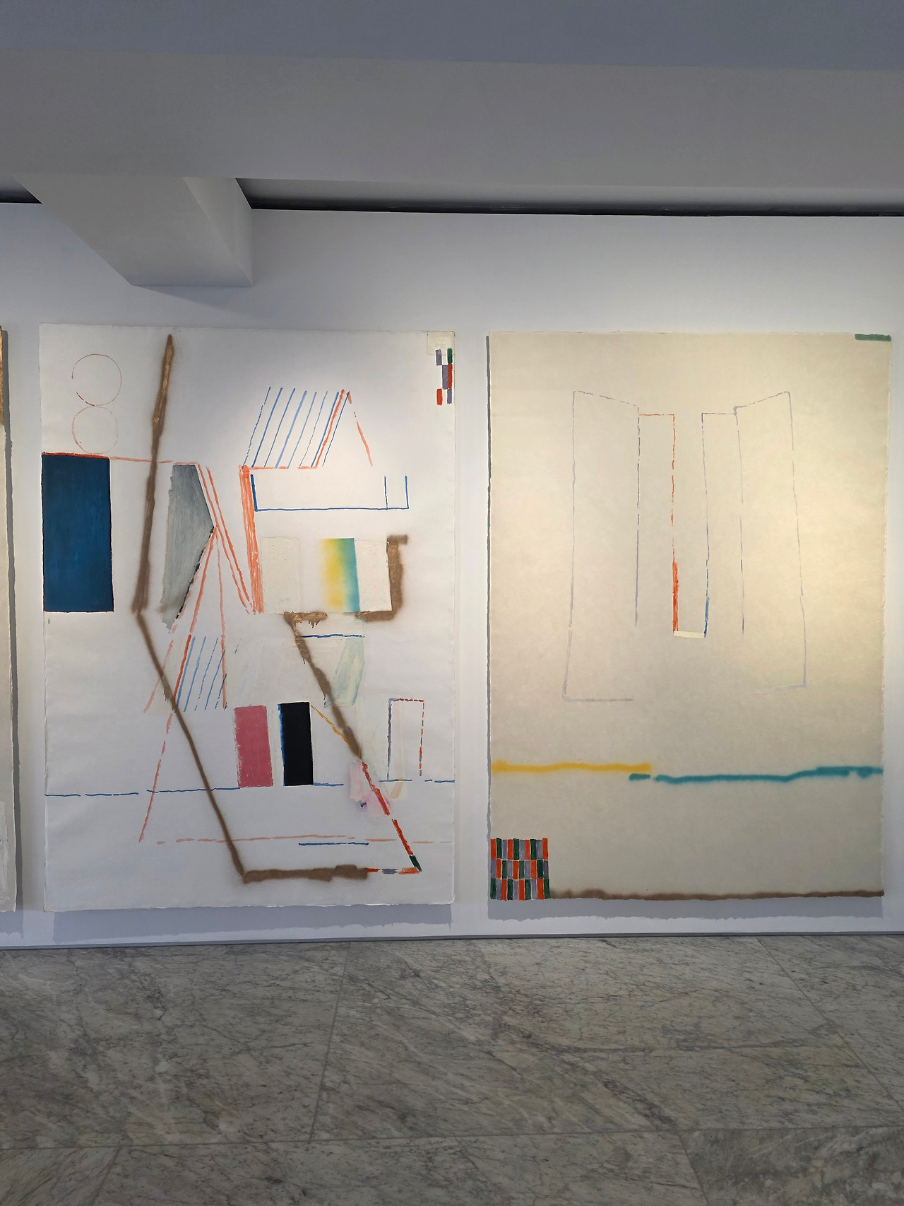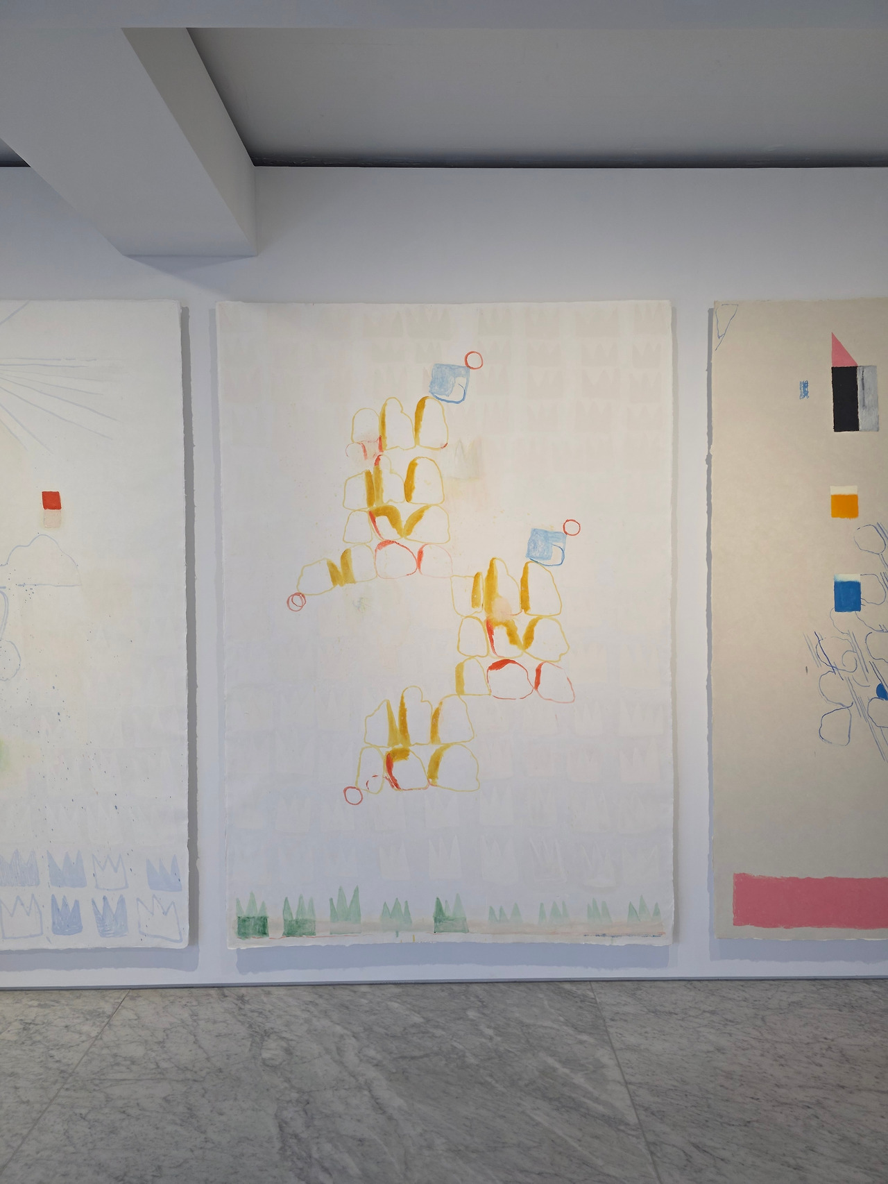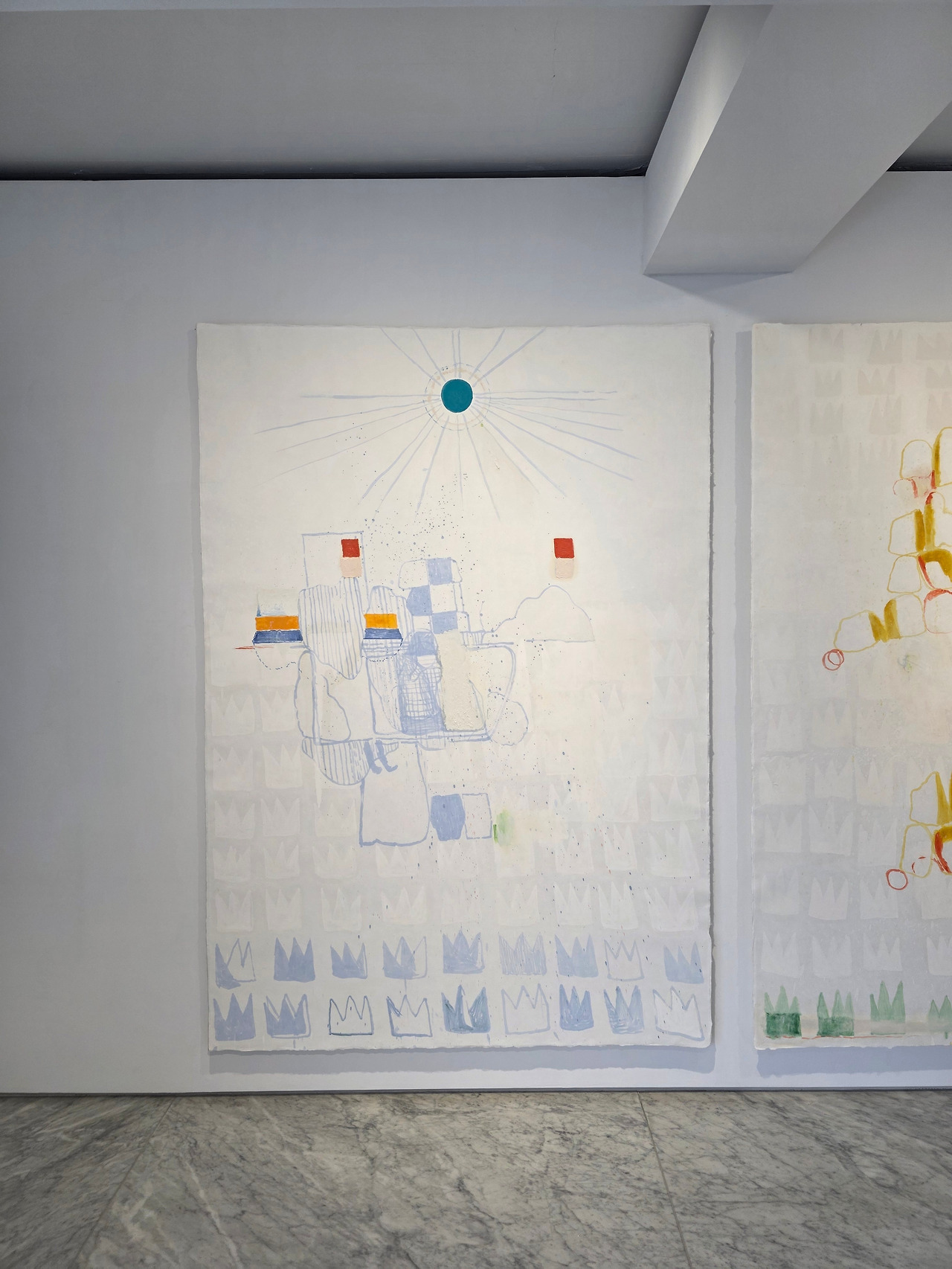 그런데 전시장에 들어서면 뭔가... 생각했던 느낌이 아니다. 실망했다는 게 아니라, 뭔가 내가 가진 ‘백현진’의 인상과도, 서울에 대한 인상과도 조금 다르다. 일단 무겁지 않고 가벼운 터치다. 파릇한 풀 같은 기호가 많아서인가, 봄 같기도 하다. 작품에 붙여진 제목도 무겁거나 어렵지 않다. ‘출발’, ‘갈팡질팡’, ‘봄’, ‘겨울’, ‘난제’ 등 어렵지 않다. 무엇이건 시작과 끝이 빠르게 교차하는 서울에서의 감정을 산뜻하게 담고 있다. 작품으로는 이런 느낌을 담는 사람이란 말인가!