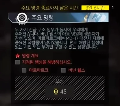 첫번째퀘스트는 버넌웰스 행성의 한 아동병원에 아동을 포함한 민간인 4천명이넘은 생존자들이 갇혀있으며 이를 외계생명체로부터 생존자들을 구출해 해방하라는내용.