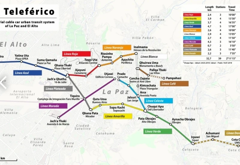 단연코 에보 모랄레스 전 대통령의 업적 가운데 하나는 텔레페리코 설치라고 할 수 있다. 분지 지역인 라파즈는 매우 넓지만 경사가 많은지라 도로가 적고 좁다. 그래서 교통 체증이 심하다. 그래서 대중교통을 하늘에 메단 것이다. 라파즈의 들쭉날쭉한 고도를 고려하면 하늘에 있는 대중 교통은 이러한 한계들을 모두 극복한다.