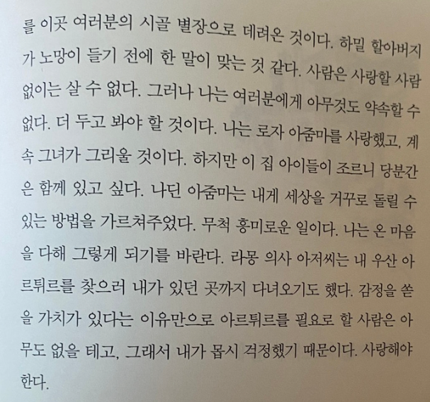 이 집 아이들이 조르니 당분간은 함께 있고 싶다. 감정을 쏟을 가치가 있다는 이유만으로 아르튀르를 필요로 할 사람은 아무도 없을 테고, 그래서 내가 몸시 걱정했기 때문이다. 사랑해야 한다.