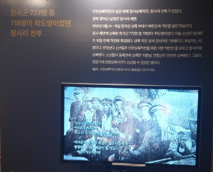 그곳의 자료에 따르면, 학도병은 1950년 6·25 전쟁 당시 학생 신분으로 자진 참전하게 된 14세에서 17세 정도의 학생입니다. 이들은 제대로 훈련도 받지 못한 채 계급장이나 군번도 없이, 수류탄 몇 개와 총 한 자루를 들고 전장에 뛰어들었습니다.