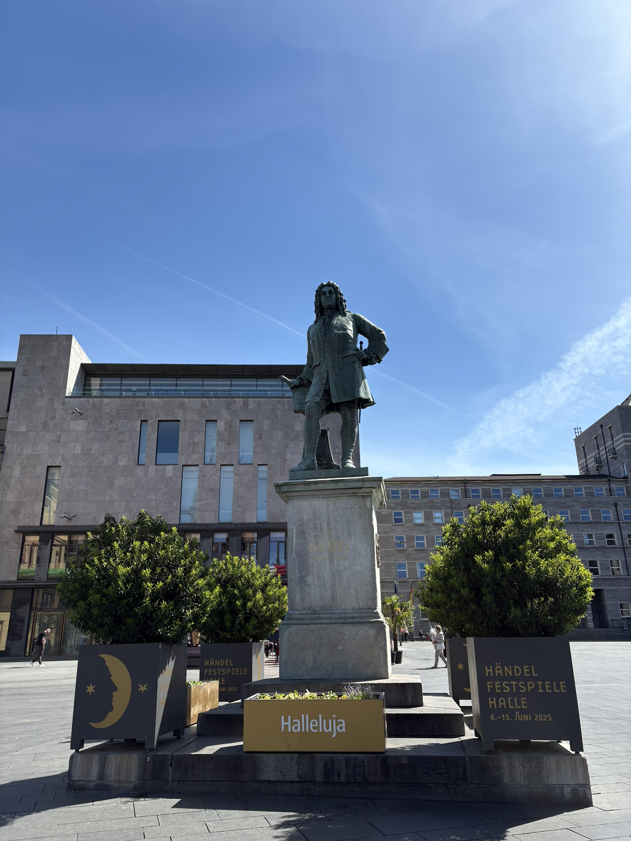 작은 아이와 함께 산책을 하듯 걸어 공연장으로 향했다. 한적한 도로, 작은 냇가에 흐르는 물소리, 그리고 강아지와 함께 물장난을 치고 있는 한 중년 커플. 8시를 향해 가지만 아직 어둠의 시작은 찾아볼 수 없는 유럽의 여름. 우리는 "Georg Friedrich Händel" 공연장을 찾았다. 우리가 두 번째로 찾은 도시는 음악의 어머니 헨델이 태어난 도시다. 여기저기서 "Händel"이라는 이름을 쉽게 볼 수 있는 곳 할레. 웅장한 체격에 힘 있게 말아진 긴 머리카락을 자랑하는 헨델 동상들도 쉽게 볼 수 있다. 할레에서 태어난 헨델은 나중에 영국으로 귀화하여, 헨델의 묘는 웨스트 민스턴 사원에 있다고 한다. 화려한 도시 생활을 꿈꿨던 헨델, 음악의 아버지인 바흐와는 다르게 귀족을 위한 노래를 많이 만들었고 결국 사교계가 화려한 영국으로 귀화하여 음악 활동을 펼쳤다고 한다. 독일어로는 게오르그 프리드리히 헨델이지만, 영어로는 조지 프레드릭 헨델이다.