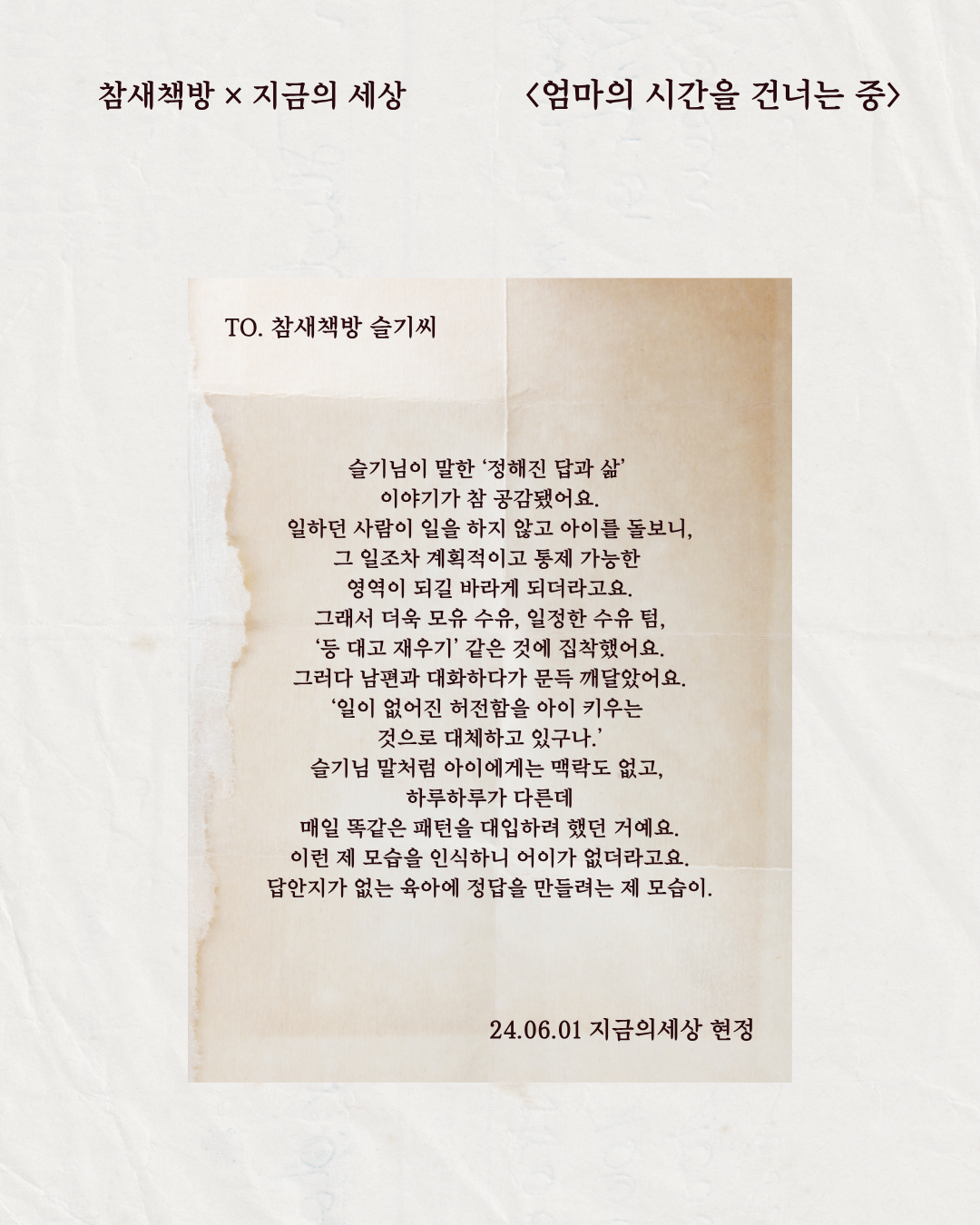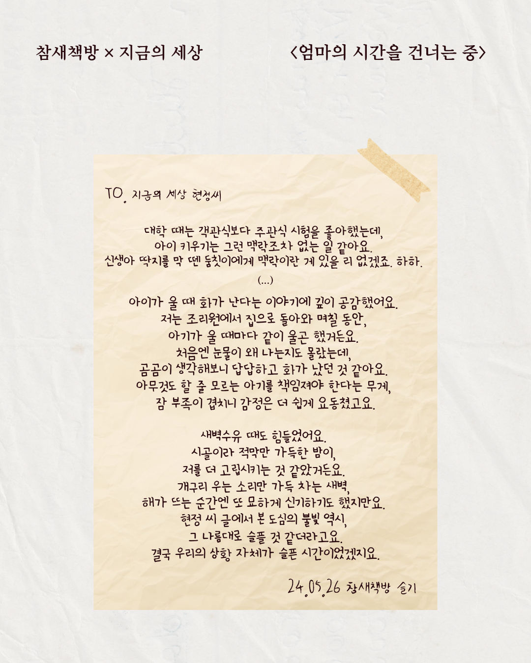첫 답장을 받았을 때 정말 설레었어요. 현정 씨 마음은 어땠을지, 또 딸기는 엄마와는 어떤 일상을 보내고 계실지 궁금했어요. 임신했을 때 먼저 아이를 키우던 친구들이 참 대단해 보였는데, 막상 제 차례가 되니 존경심만 더 커졌어요.