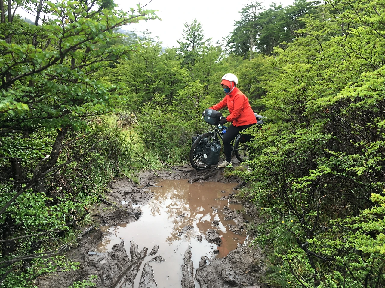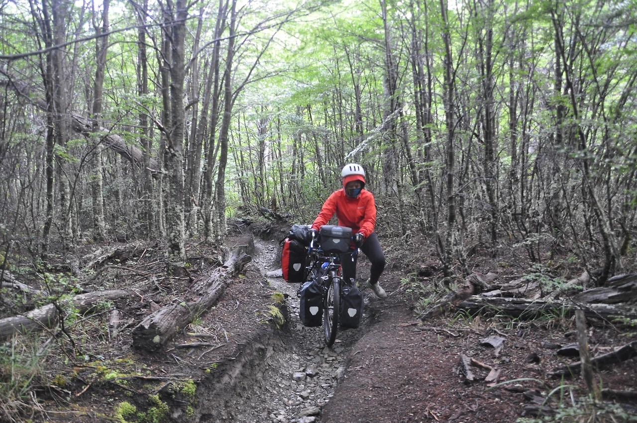 쉽지 않았다. 파타고니아를 달려온 한 달도 정말 쉽지 않았는데, 칠레에서 아르헨티나로 넘어가려는 그 마지막 길은 자전거 여행을 통틀어 단연코 가장 힘든 길이었다. 자전거 무게 15kg, 그 위에 실은 짐을 합해 나는 총 50kg를, 남편은 70kg의 짐덩이 같은 자전거를 끌며, 들어 올리며, 당기며 20km의 트레킹길을 지나야 했다. 산속에 난 조막만 한, 사람 하나 겨우 지나갈만한 길을 자전거와 함께 지나고, 사람 키 높이의 진흙벽이 수시로 나와 기어오르고 자전거와 짐을 들어 올렸다. 길이 갑자기 끊기고 난데없이 나타난 무릎 깊이의 진흙 늪을 걸어야 했다. 전날 내린 비로 물이 무릎 높이까지 불어난 냇가에는 다리가 없어 맨몸으로 그냥 건넜다. 자전거를 들어 옮기고, 돌아와서 양손에 자전거 가방을 들고 옮기고, 이 과정을 몇 번씩 반복했다. 이렇게 냇가를 겨우 하나 건너면 또 하나, 건너면 또 하나... 늪과 강, 진흙, 난데없는 급 오르막이 게임의 끝판왕처럼 끝도 없이 펼쳐졌다.