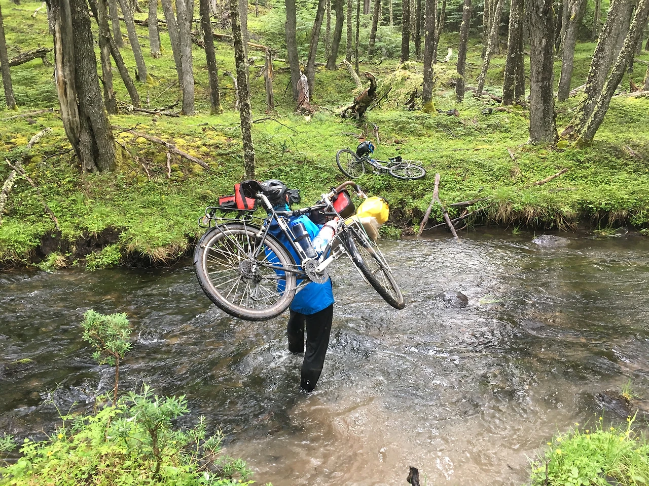 마지막 1km쯤을 남겨놓은 시점. 몇 번이고 페달에 다리를 찍히고, 넘어지고, 자전거에 끌려가던 남편은 정말로 모든 에너지를 다 써버린 듯했다. 무릎이 나가 제대로 걷지도 못하고, 70kg짜리 짐짝을 수백 번도 더 들고 내려 팔에 힘도 주지 못했다. 사람 하나가 걷기도 어려운 좁디좁은, 길이랍시고 파놓은 구덩이는 자갈과 진흙이 구르는 급격한 내리막이었다. 브레이크는 이미 닳아버려 멈춰지지도 않는 그 무거운 자전거를 오로지 팔힘만으로 지탱하며 내리막을 내려가다 넘어지고, 또 넘어지고를 반복했다. 이 이상 내려가다간 크게 사고가 날 것 같아 눈앞이 캄캄해졌다. 그러다 번뜩, 아까 우리를 앞질러 간 하이커 두 명이 생각났다. 분명 선착장 앞에서 캠핑을 한다고 했었다.