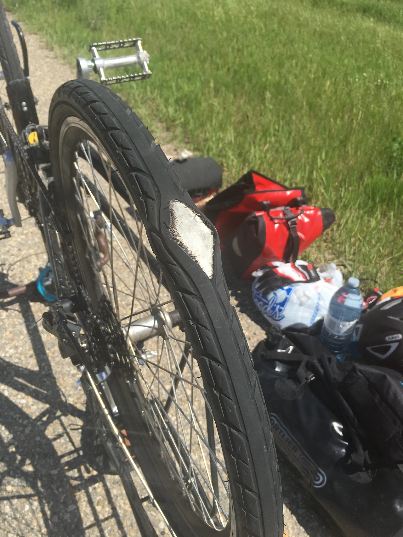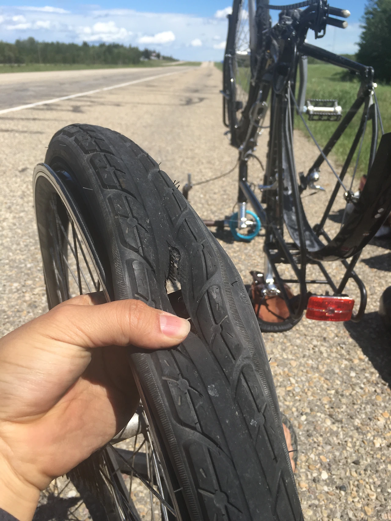 다행히 이럴 때를 대비해서 한국에서 준비해온 것이 있었다. 바로, 타이어 패치. 패치 뒤의 접착면을 드러나게 한 후, 타이어에 탄탄하게 붙여주기만 하면 끝이었다. 타이어가 찢어진 건 아깝지만, 우선 이렇게 패치로 버티고 도시에 들어가면 새 타이어를 사면 되는 일이니 어려운 것도 아니었다. 패치가 충분히 튼튼하게 붙었다고 생각한 후, 다시 앞으로 달리기 시작하자마자 타이어 패치를 열심히 붙인 보람도 없이 다시 ‘퍽’ 소리가 나며 터져버렸다. 아놔... 패치는 아무 소용이 없다는 걸 깨달았다.