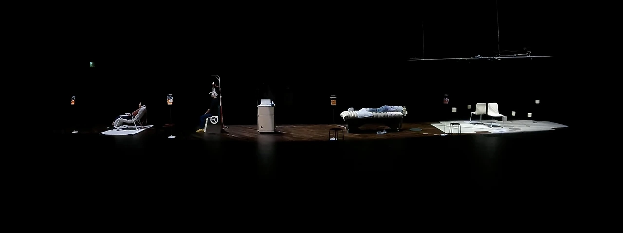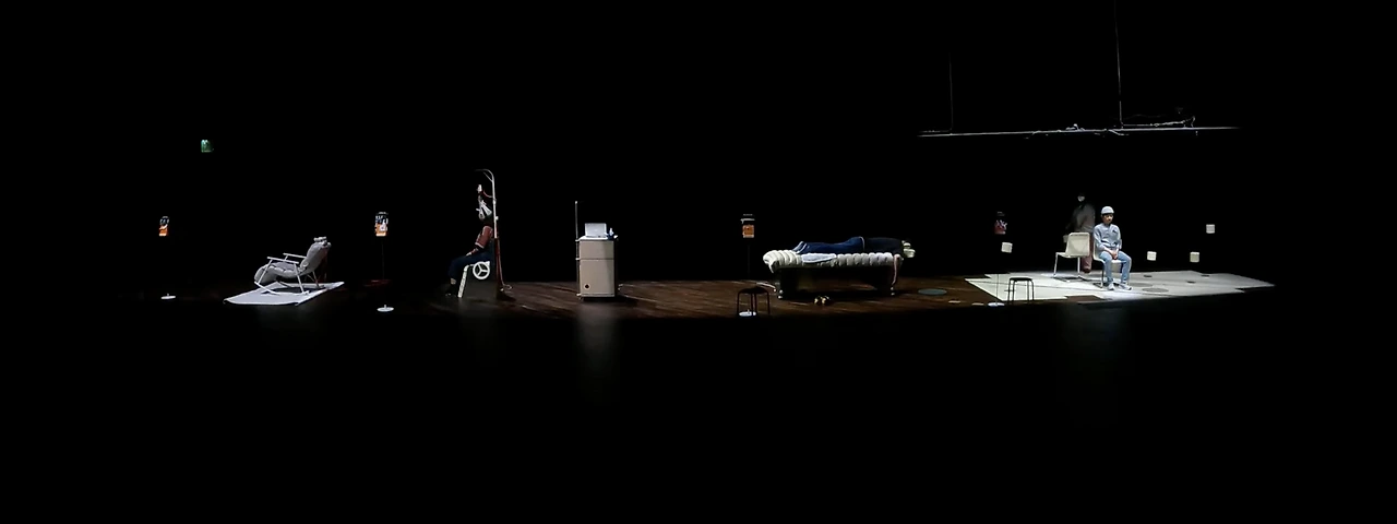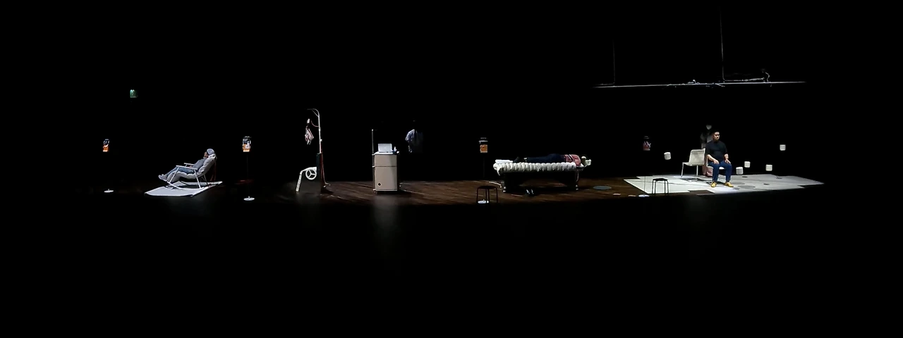관람석에서 바라본 마사지 침대 모양의 기구는 편해 보이지만 남들이 보는 곳에서 눕는다는 것이 동시에 살짝 민망해 보이기도 했다. 사실 어둠속의 관객이 모두 나를 바라보고 있다는 것은 나에게는 매우 부담스러운 일이지만, 무대의 밝은 조명으로 안과 나누어진 무대 밖의 공간은 단지 짙은 어둠의 빈공간으로 느껴질 뿐이었다.
