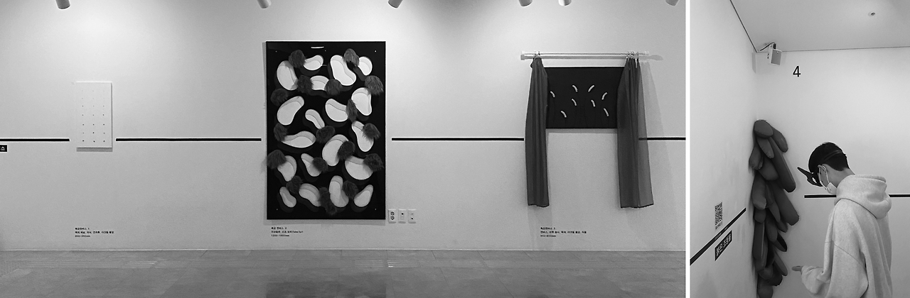 작품을 마음대로 편하게 만져도 된다는 작가님의 목소리가 뒤에서 들렸다. 촉각 가이드선 사이 사이에 작품들이 걸려있었다. 이것은 벽에 걸린 회화라 할 수 있지만, 촉각으로 직접 만지면서 감상을 하도록 디자인된 작품이었다. 손이 닿을 가까운 거리에서는 잠자리 가면으로도 어느 정도 작품의 큰 형태는 느낄 수 있었다. 잠시 눈을 질끈 감고 다시 촉각에만 의지해 보기로 했다. 소품의 캔버스 위에 자잘한 돌기가 손 끝에 느껴졌다.
