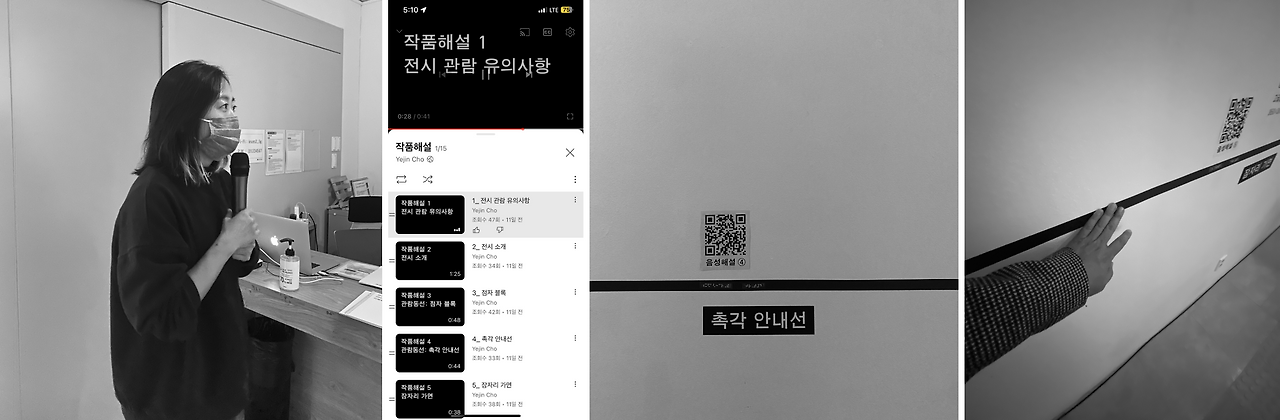 전시장입구의 고요함고 두꺼운 철문은 왠지 수술실 문처럼 느껴졌다. 다행히 문 옆의 전시 관련 화면과 전시를 소개하는 QR 코드가 안심시켜 주었다. 조용히 문을 열고 들어선 하얀 전시 공간은 그 벽의 중앙을 따라 안정감 있는 긴 검은색 선이 이어지면 시선을 끌어 주었다. 벽 틈으로 전시를 설명하고 있는 작가님의 모습과 목소리가 보였다.