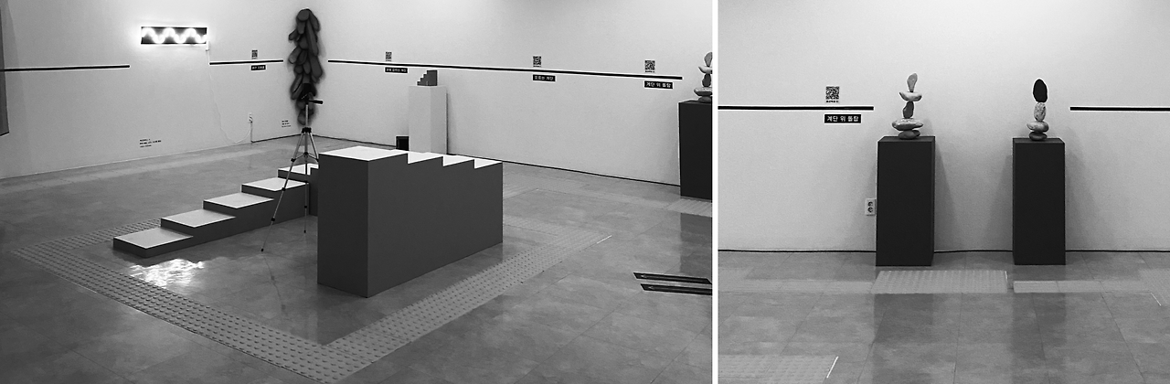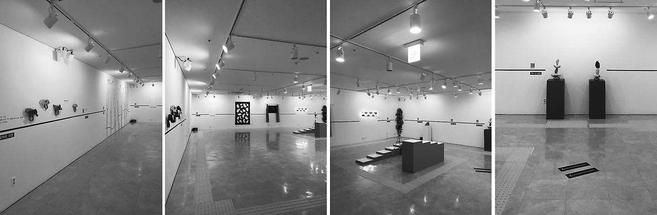 눈으로 보이는 전시장은 정사각형에 가까운 형태로 하얀 벽면을 둘러 전시물들을 이어주는 촉각안내선은 정돈된 공간의 시각적 안정감을 주었다. 눈에는 벽면을 따라 작품이 전시된 익숙한 전시장의 모습이 보였다. 여기에, 입구에서 부터 전시장 가장 자리를 따라 이어진 짙은 노란색의 점자블럭이 만드는 여러 사각형의 조화는 한결 더 시각적인 안정감을 주었다. 한눈에 들어오는 한없이 안정적인 공간감으로 가득찬 전시장이었다.