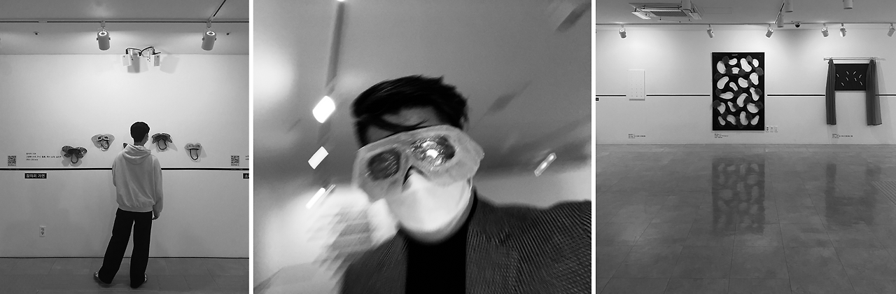 그러나 그 안정감은 곧 사라져버렸다. 배리어프리와 시각장애인을 의식하며 입구에서 2-3 미터의 그 거리를 눈을 살짝 살짝 찡그리며 벽에 손을 대고 이동했지만, 눈을 꽉 감는 것은 왠지 불안하고 불편했다. 정말 짧은 순간인데 그러했다. 그러나, 나는 잠자리 가면을 선택해야 했다. 잠자리 가면의 눈은 다양한 왜곡된 렌즈들로 만들어져 있었다. 그 중에는 전혀 보이지 않게 검정으로 칠해진 렌즈도 있었다. 눈에 이상이 가는 것도 아닌데, 아무것도 보이지 않는 검정 렌즈의 잠자리 가면은 감히 선택하지 못했다. 나는 묘한 스크래치가 가득하지만, 앞을 볼 수 있는 가면을 선택했다. 가면을 끼고 잠시후 마스크의 호흡으로 렌즈에 김까지 서리며 나는 앞이 보이지만 보이지 않는 상황을 마주하게 되었다.