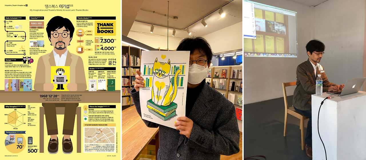 땡스북스에서 만나게 된 이기섭 대표님. 나중에 지인들이 겹치는 것도 알게 되었지만, 마당발 대표님 덕분에 홍대 주변의 많은 분들을 알게 되었고, 무엇보다 디자이너로, 사업가로, 일 벌리기 좋아하는 동네 선배처럼 늘 많은 조언과 힘을 주셨다.