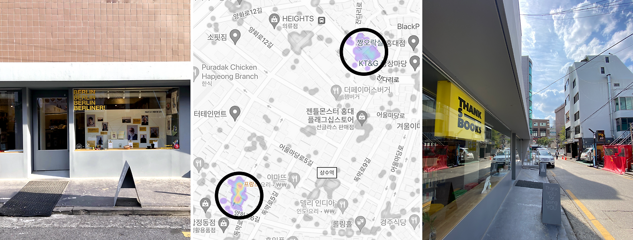 지도를 살펴보니, 홍대 근체 제일 많이 갔던 곳으로 표시된 두 지점이 땡스북스 잔다리로와 양화로.