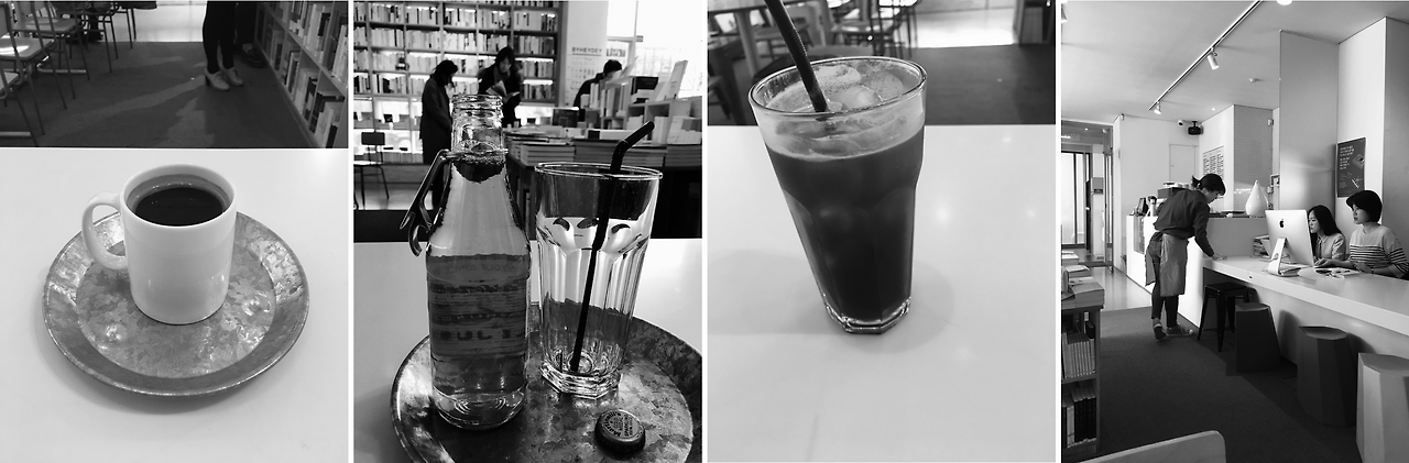 책방에 도착하면 먼저 카운터의 땡스북스 분들과 인사를 하고, 자리를 먼저 잡고는 책방 안을 두서너 바퀴 돌면서 탐나는 멋진 책꽂이와 책장위의 새로 큐레이션된 책들을 살펴본다. 그리고, 그 중 한두권을 집어 계산을 하고 음료를 주문한다. 따아, 아아, 그리고 좀 특별한 날에는 탄산애플주스를 시켜 마신다. 살짝 불안한 작은 양철 쟁반위의 음료를 보면 그렇게 마음에 들었다. (맞아요 그때는 이런것이 새로운 것이었어요^^)