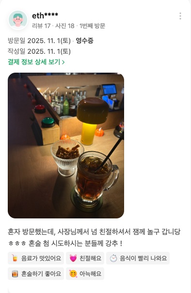 "혼자 방문했는데, 사장님께서 넘 친절하셔서 재미있게 놀구 갑니당 ㅎㅎㅎ 혼술 첨 시도하시는 분들께 강추 !"
