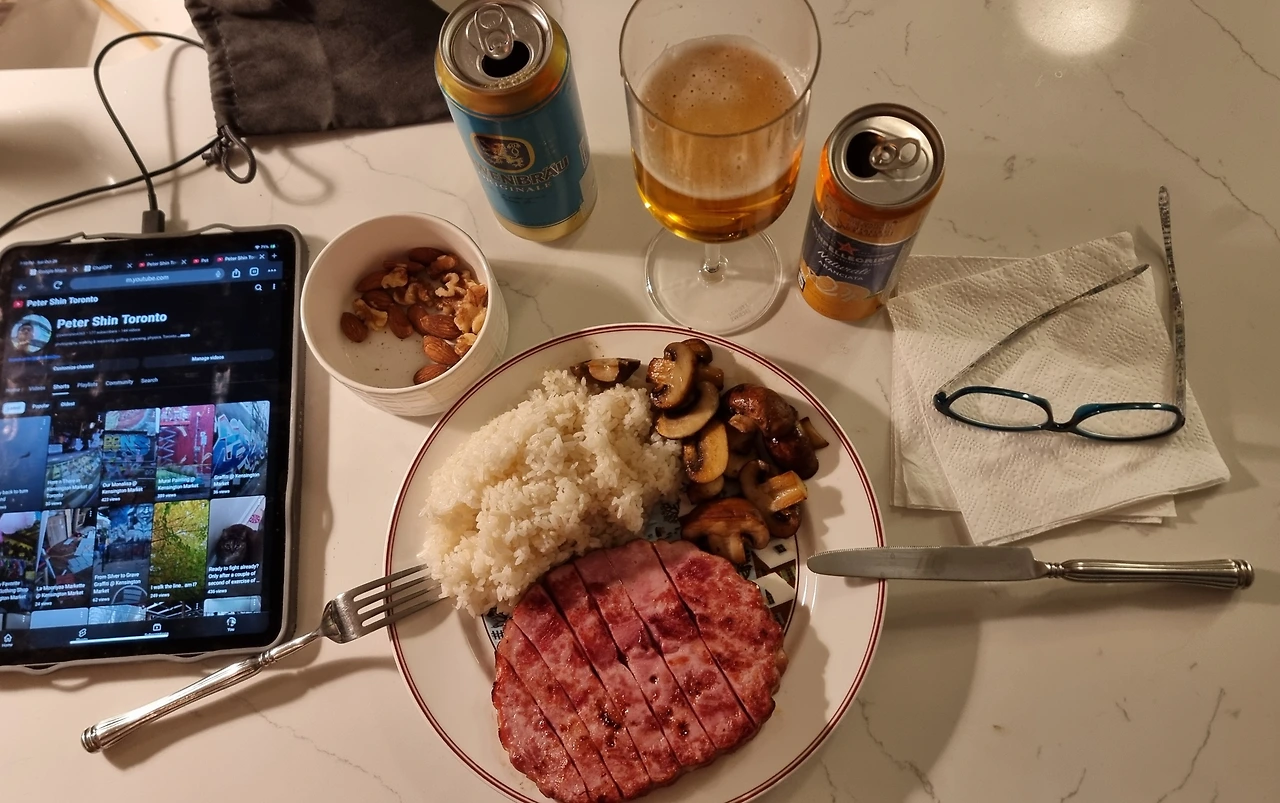 엊저녁은 거대한 햄을 두툼하게 썰어 굽고 양송이와 함께 먹었다. 딸아이 이사를 도와주기 위해 도쿄로 날아간 아내는 차도 없이 도쿄 아이키아에서 세간을 사다 지하철로 나르느라 거의 파김치가 되었다가 결국 몸져 누웠다고 카톡이 왔다. 나라도 잘먹으며 씩씩하게 지내야겠다. 요새 난 유튜브 short form 컨텐트 찍느라 신난다. DJI gimbal을 사서 mechanical gyro가 확보되니 점점 비디오 퀄러티가 좋아진다. Insta guy 에서 You-Tube guy로 빠르게 변신 중이다. Peter Shin Toronto 란 이름으로 유튜브에서 활동중이다.