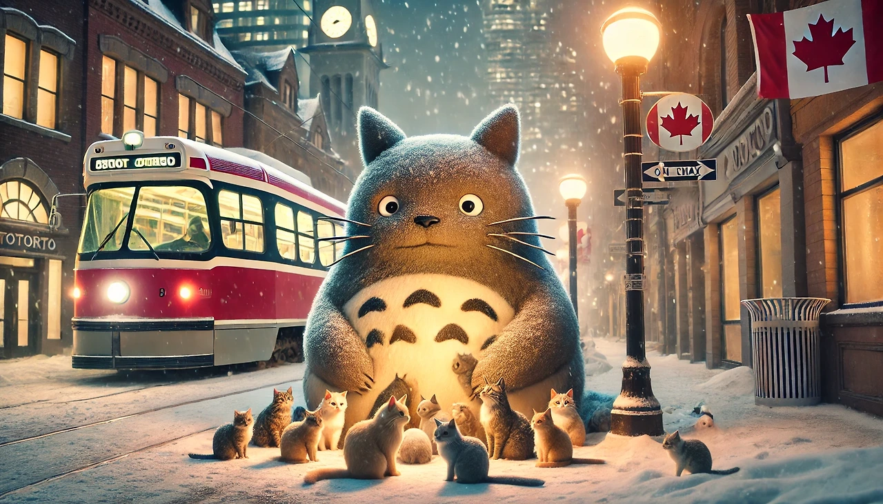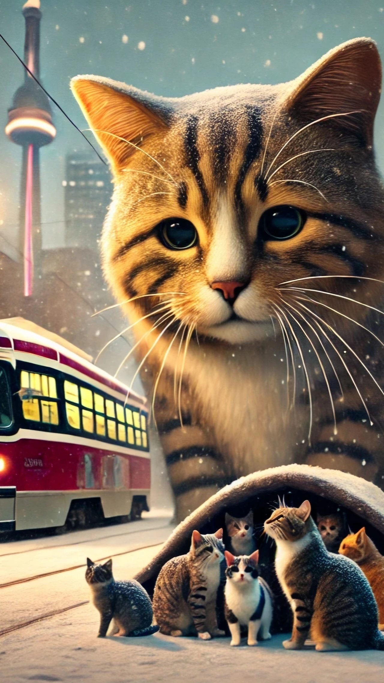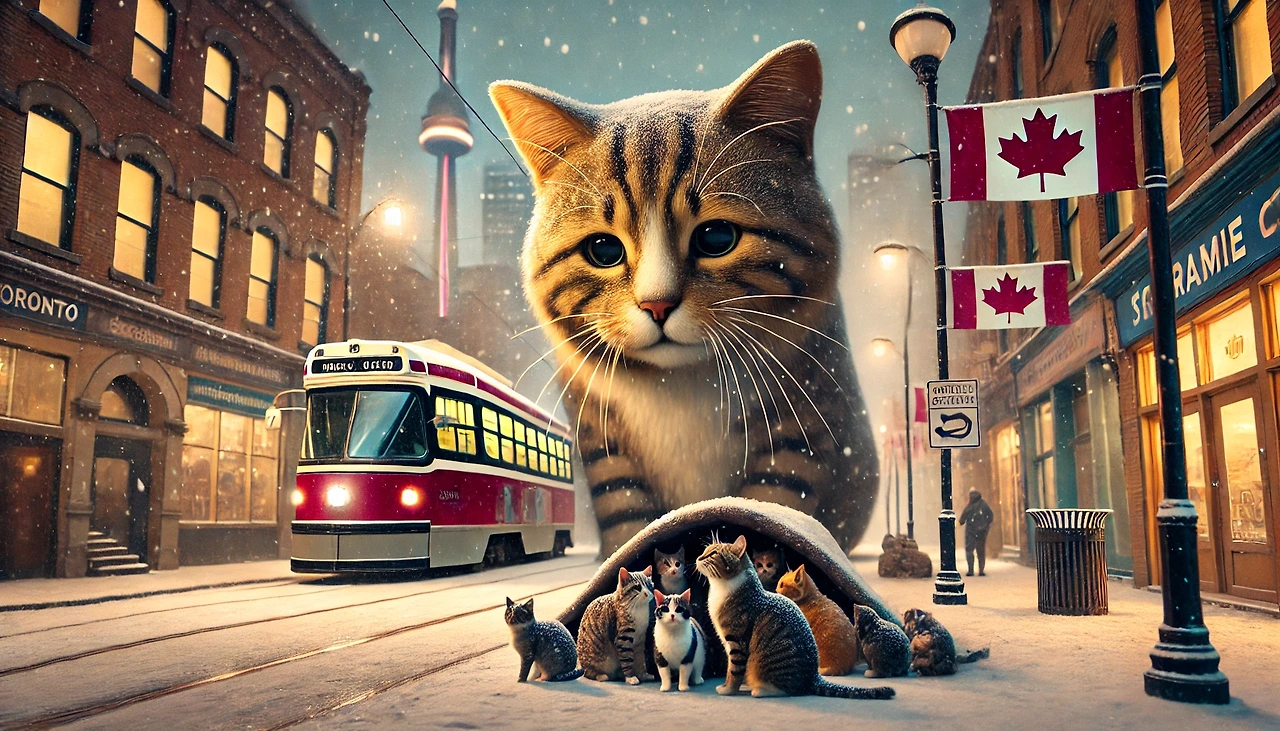 'Picture a giant, Totoro-like Cat wandering Toronto's cold, empty streets, gathering stray cats under its warm, plush fur.'